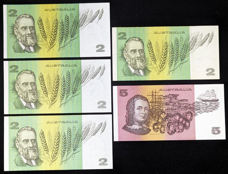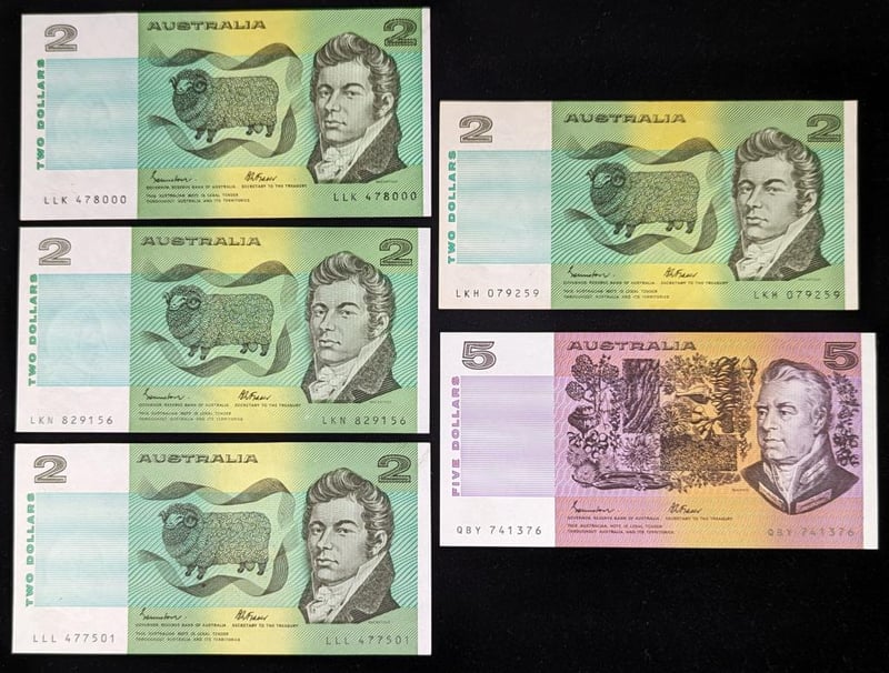 FOUR AUSTRALIAN TWO DOLLAR BANKNOTES AND FIVE DOLLAR BANKNOTE SIGNED BY JOHNSTON/FRASER
