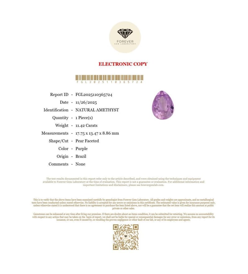 11.42 CARATS NATURAL AMETHYST 11.42 Carats Natural AmethystCertificate Number - Fgl2025110365724Color - PurpleShape - Pear FacetedDimension - 17.75 X 13.47 X 8.86 MmOrigin - BrazilComments - NoneGood Quality With Luster Condition: Good - Refer Images 0488496+3