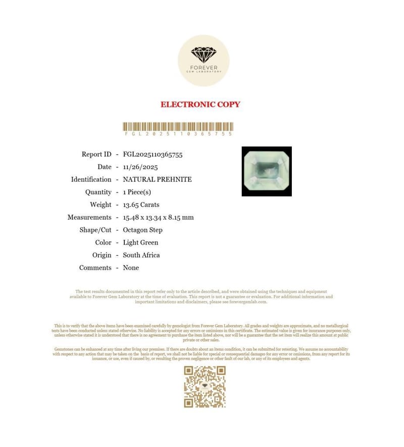 11.01 CARATS NATURAL GREEN TOURMALINE 11.01 Carats Natural TourmalineCertificate Number - Fgl2025110365756Color - GreenShape - Octagon StepDimension - 12.63 X 11.99 X 8.82 MmOrigin - MadagascarComments - NoneGood Quality With Luster Condition: Good - Refer Images 0488496+34