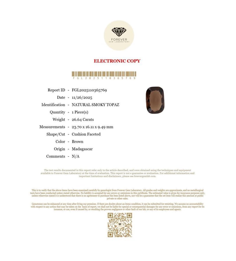 27.32 CARATS NATURAL SMOKY TOPAZ 27.32 Carats Natural Smoky TopazCertificate Number - Fgl2025110365770Color - BrownShape - Oval FacetedDimension - 25.10 X 18.15 X 10.45 MmOrigin - MadagascarComments - N/AGood Quality With Luster Condition: Good - Refer Images 0488496+48