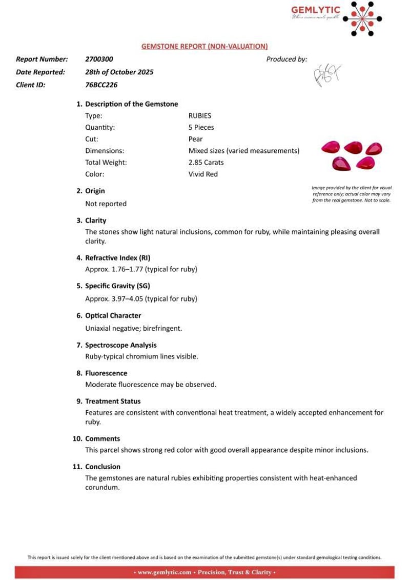 RUBIES - 2.85 CARATS - VIVID RED Quantity: 5 PcsReport Number: 2700300Clarity: The Stones Show Light Natural Inclusions, Common For Ruby, While Maintaining Pleasing Overall Clarity.Measurements: Mixed SizesTreatments: Features Are Consistent With Conventional Heat Treatment, A Widely Accepted Enhancement For Ruby.Origin: Not ReportedRefractive Index: Approx. 1.76–1.77 (Typical For Ruby)Specific Gravity: Approx. 3.97–4.05 (Typical For Ruby)Spectroscope Analysis: Ruby-Typical Chromium Lines Visible.Fluorescence: Moderate Fluorescence May Be Observed.Comments: This Parcel Shows Strong Red Color With Good Overall Appearance Despite Minor Inclusions.Conclusion: The Gemstones Are Natural Rubies Exhibiting Properties Consistent With Heat-Enhanced Corundum. Condition: Good - Refer Images 0488985+3