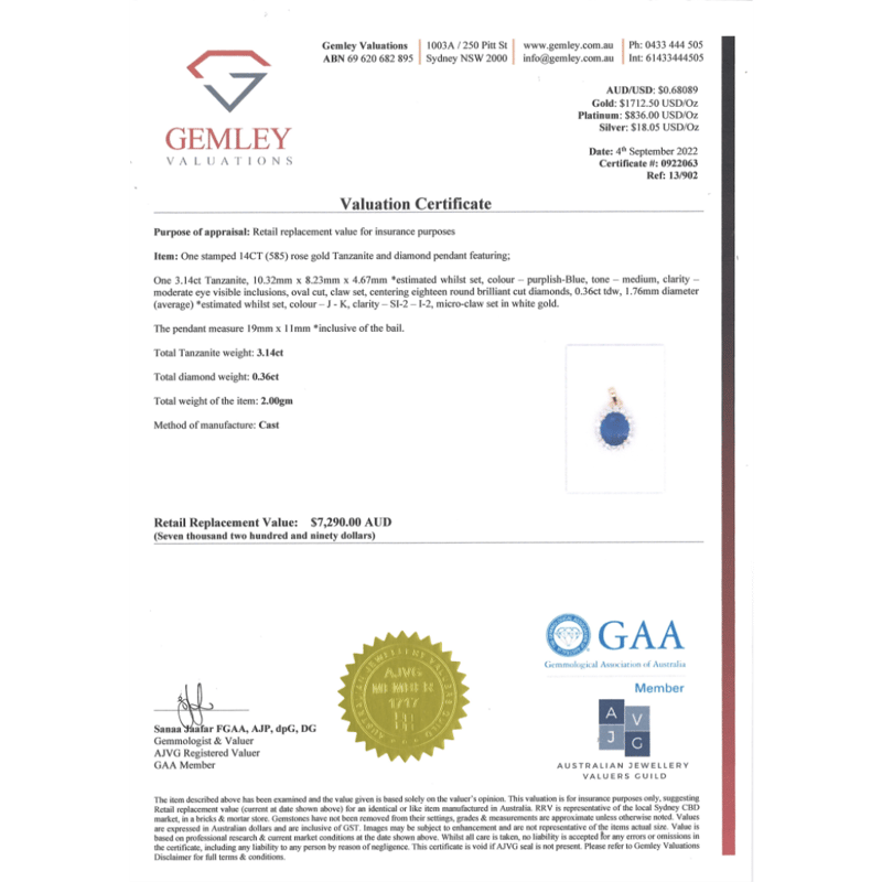 Provenance: The Centre Features, One Oval Cut, Medium Purplish Blue, Tanzanite (3.14Ct Tsw, Moderate Eye Visible Inclusions), 4 Claw Set. Surrounding The Centre In A Halo And Decorating The Bail Are, 18 Round Brilliant Cut, Diamonds (0.36Ct Tdw, J-K Colour, Si2-I2 Clarity), Micro-Claw Set In White Gold.