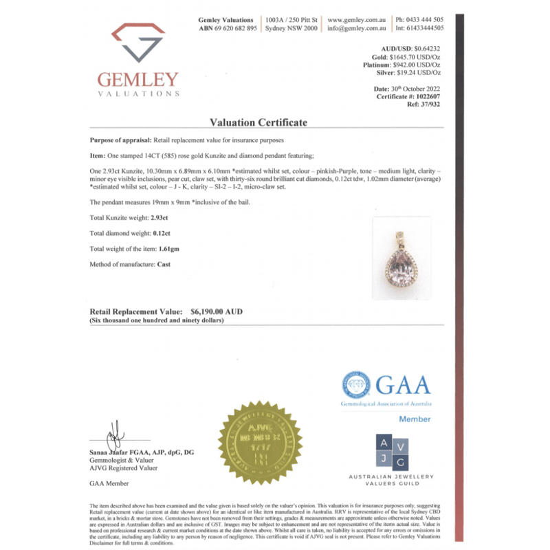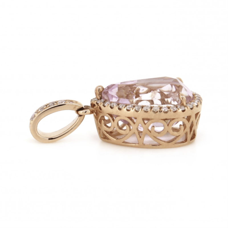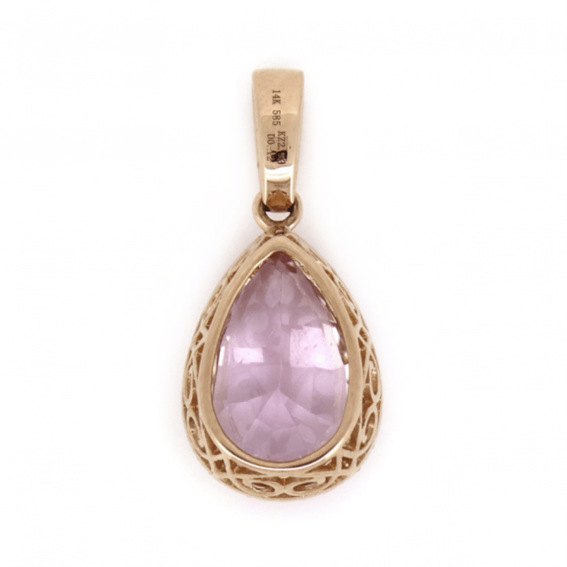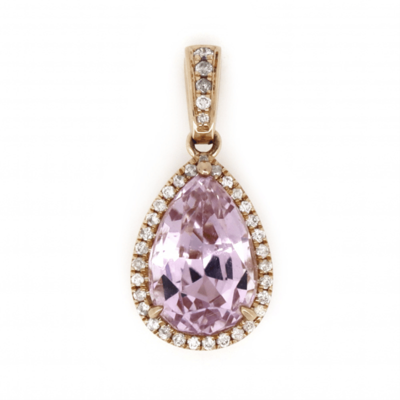 14K ROSE GOLD, KUNZITE AND DIAMOND, HALO PENDANT.Provenance: The Centre Features, One Pear Cut, Medium Light Pinkish-Purple, Kunzite (2.93Ct, Minor Eye Visible Inclusions), Claw Set. Surrounding The Centre In A Halo And Decorating The Bail Are, 36 Round Brilliant Cut, Diamonds (0.12Ct Tdw, J-K Colour, Si2-I2 Clarity), Micro-Claw Set.Insurance Replacement Valuation Amount: $6,190.00488493+5
