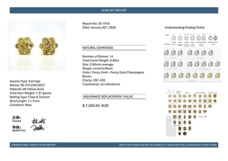 9CT YELLOW GOLD FANCY CHAMPAGNE BROWN DIAMOND FLORAL STUD EARRINGS Featuring, 14 Round Brilliant Cut, Fancy Vivid - Fancy Dark Champagne Brown Diamonds (0.85Ct Tdw, Vs1-Vs2 Clarity), Claw/Tension Set. Valuations Provided by an Independent Third-Party Professional Not Directly Associated With Lloyds Auctions at AUD $7200This valuation has been conducted by an independent third-party professional. The valuation amount is an assessment by the issuing valuer and does not reflect the auction value of the item. Any inquiries regarding the valuation should be directed to the issuing valuer (refer to contact details on the certificate), as Lloyds Auctions has no affiliation or influence over the valuation, the valuer, or the stated amount. Condition: Good - Refer Images 0582881+1964