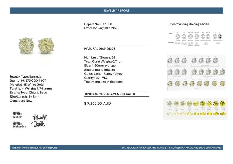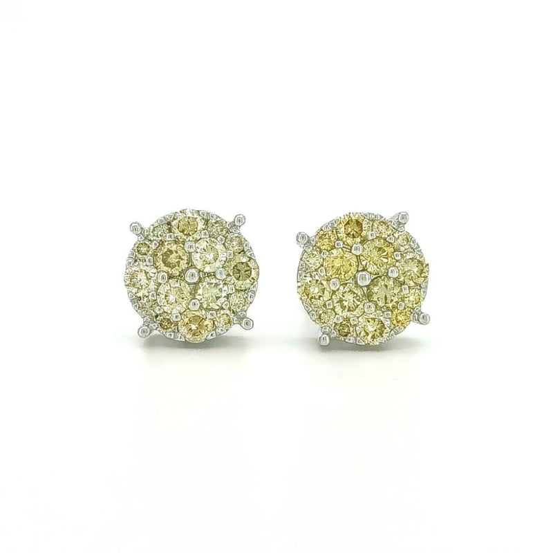 9CT WHITE GOLD FANCY YELLOW DIAMOND CLUSTER STUD EARRINGS Featuring, 32 Round Brilliant Cut, Light - Fancy Yellow Diamonds (0.71Ct Tdw, Vs1-Vs2 Clarity), Claw/Bead Set. Valuations Provided by an Independent Third-Party Professional Not Directly Associated With Lloyds Auctions at AUD $7200This valuation has been conducted by an independent third-party professional. The valuation amount is an assessment by the issuing valuer and does not reflect the auction value of the item. Any inquiries regarding the valuation should be directed to the issuing valuer (refer to contact details on the certificate), as Lloyds Auctions has no affiliation or influence over the valuation, the valuer, or the stated amount. Condition: Good - Refer Images 0582881+1965