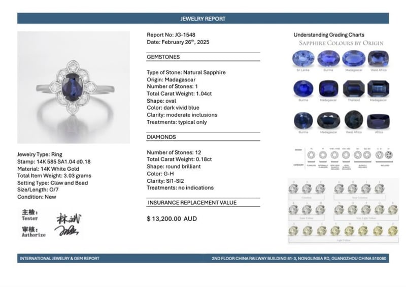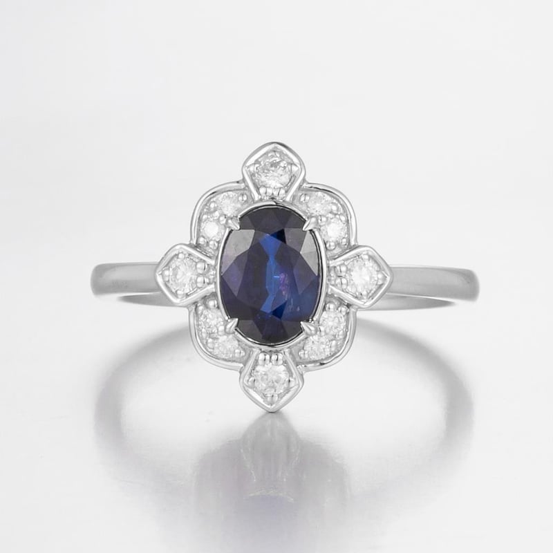 14CT WHITE GOLD MADAGASCAN SAPPHIRE AND DIAMOND VINTAGE INSPIRED RING Featuring Centre, One Oval Cut Dark Vivid Blue Madagascan Sapphire (1.04Ct, Moderate Inclusions), Claw Set, With 12 Round Brilliant Cut Diamonds (0.18Ct Tdw, G-H Colour, Si1-Si2 Clarity), Bead Set. Ring Size O. Valuations Provided by an Independent Third-Party Professional Not Directly Associated With Lloyds Auctions at AUD $13200This valuation has been conducted by an independent third-party professional. The valuation amount is an assessment by the issuing valuer and does not reflect the auction value of the item. Any inquiries regarding the valuation should be directed to the issuing valuer (refer to contact details on the certificate), as Lloyds Auctions has no affiliation or influence over the valuation, the valuer, or the stated amount. Condition: Good - Refer Images 0582881+1991