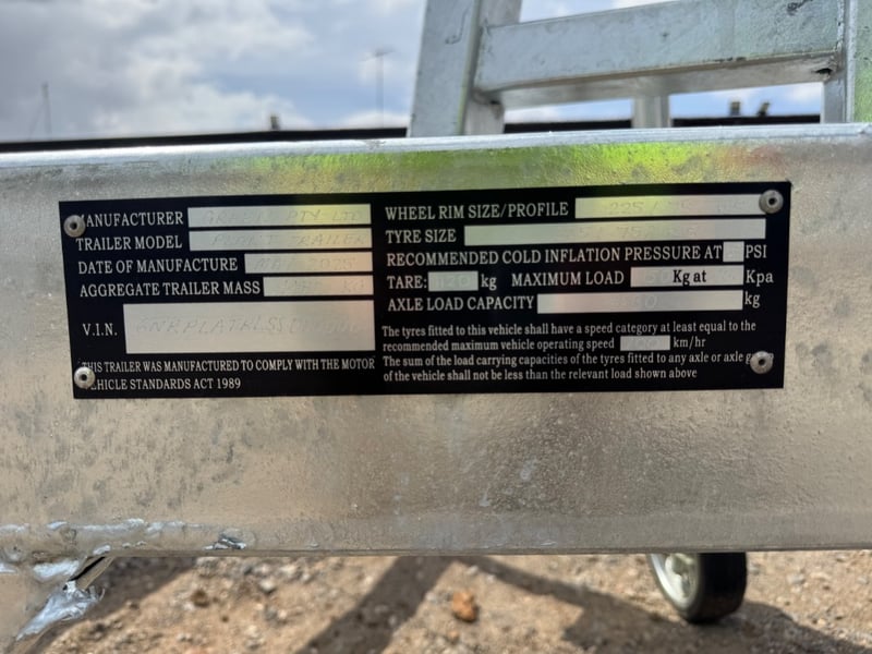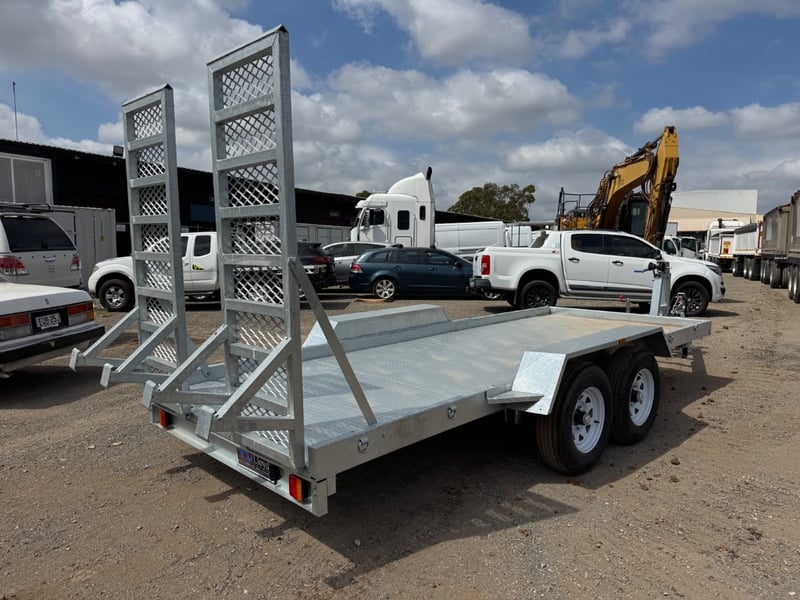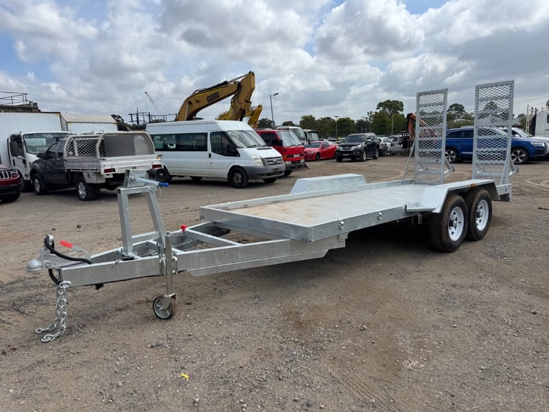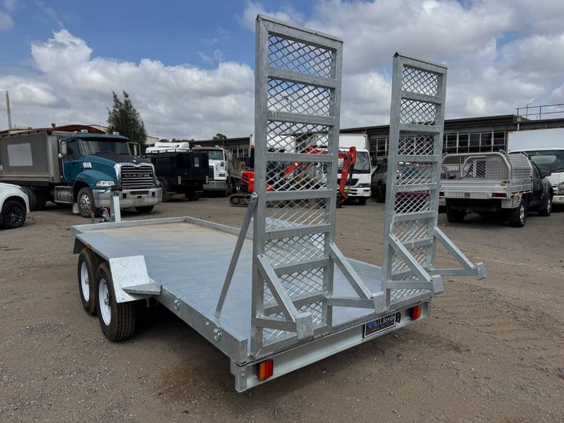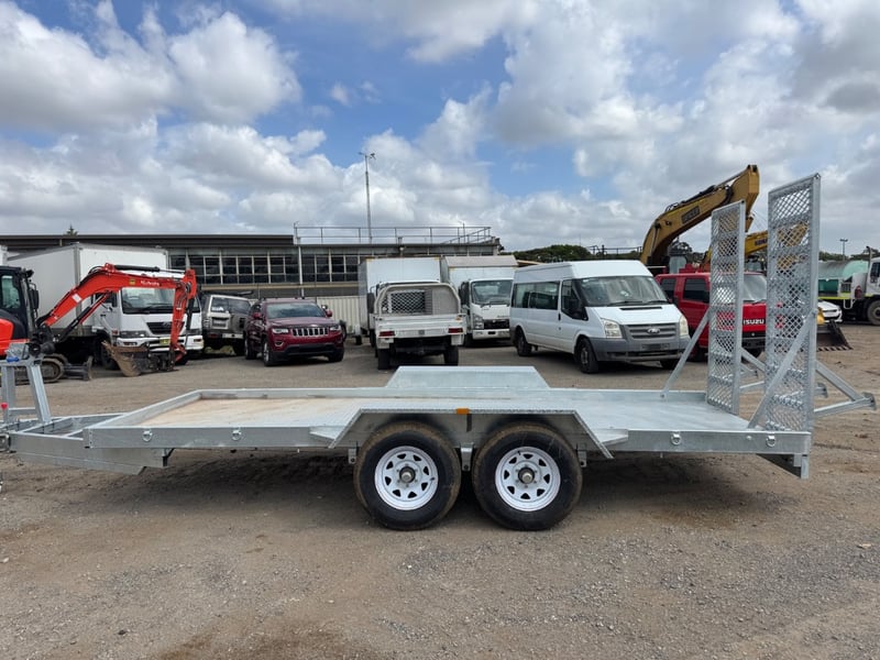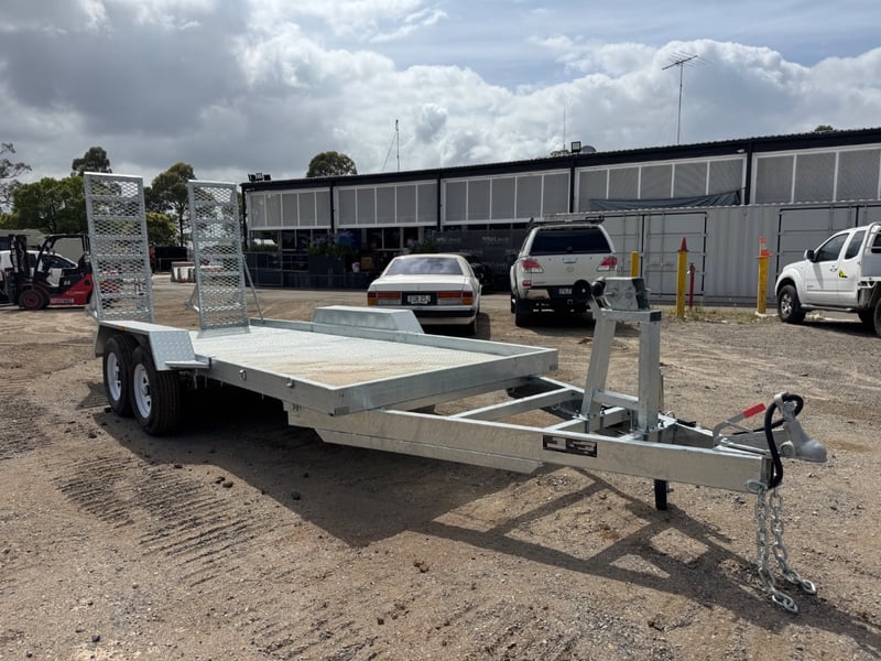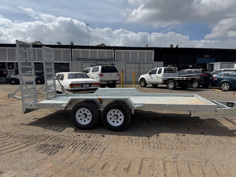 Description: Hand winch with strap, Suit 70mm tow ball, Jockey wheel, Break away unit, 7pin flat plug, Handbrake, Dual safety chains, Galvanised checker plate floor, 15inch Steel rims with 225/75R15 tyres, Folding ramps 1820mm Long x 600mm Wide, Various tie down locations, Inside Tray Dimensions: 4950mm (L) x 1780mm (W)