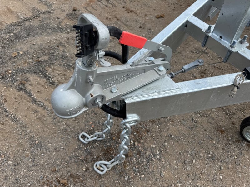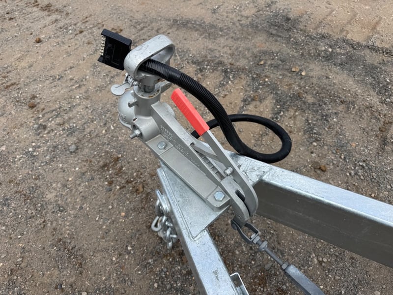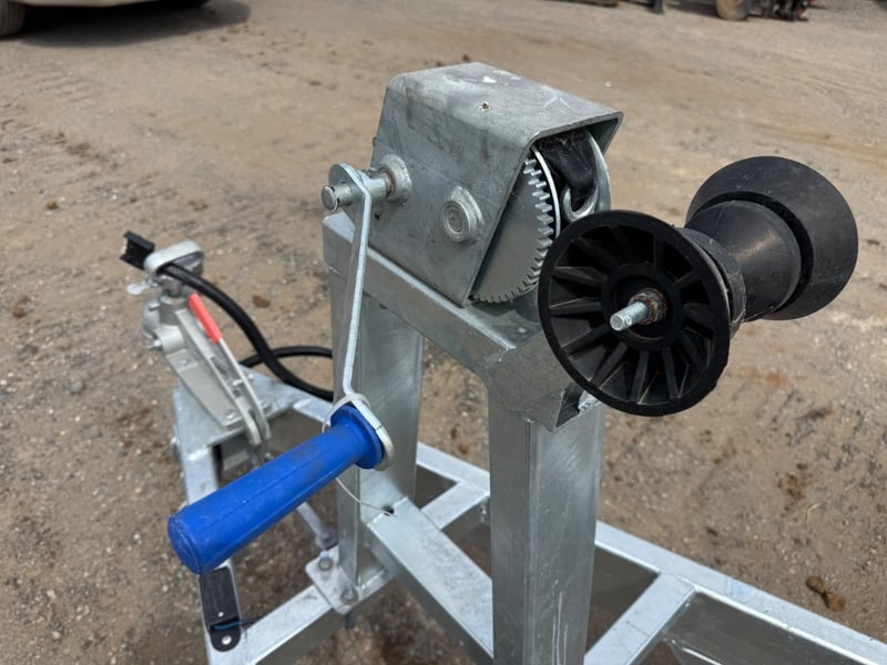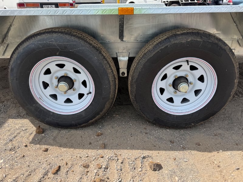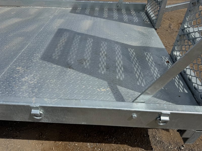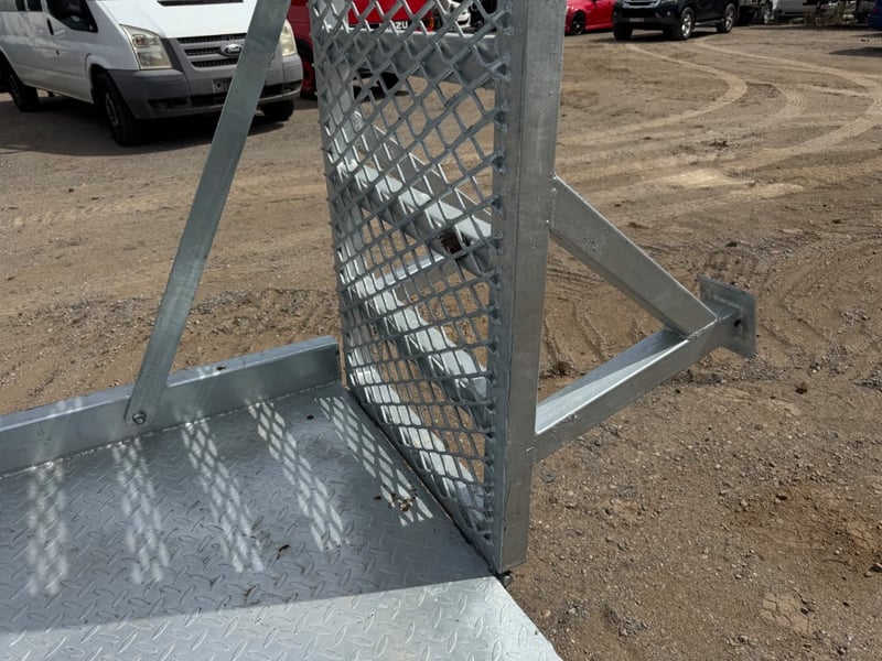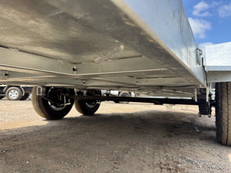 Description: Hand winch with strap, Suit 70mm tow ball, Jockey wheel, Break away unit, 7pin flat plug, Handbrake, Dual safety chains, Galvanised checker plate floor, 15inch Steel rims with 225/75R15 tyres, Folding ramps 1820mm Long x 600mm Wide, Various tie down locations, Inside Tray Dimensions: 4950mm (L) x 1780mm (W)