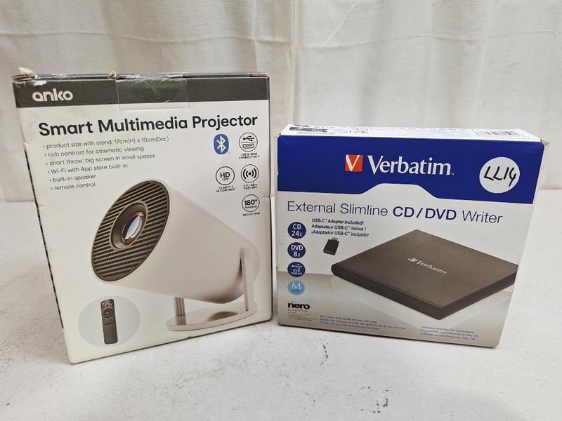 1 x ANKO smart multimedia projector, RRP:$129.00, NEW factory sealed in box, 1 x VERBATIM external slimline CD/DVD writer, RRP:$99.00, NEW factory sealed in box