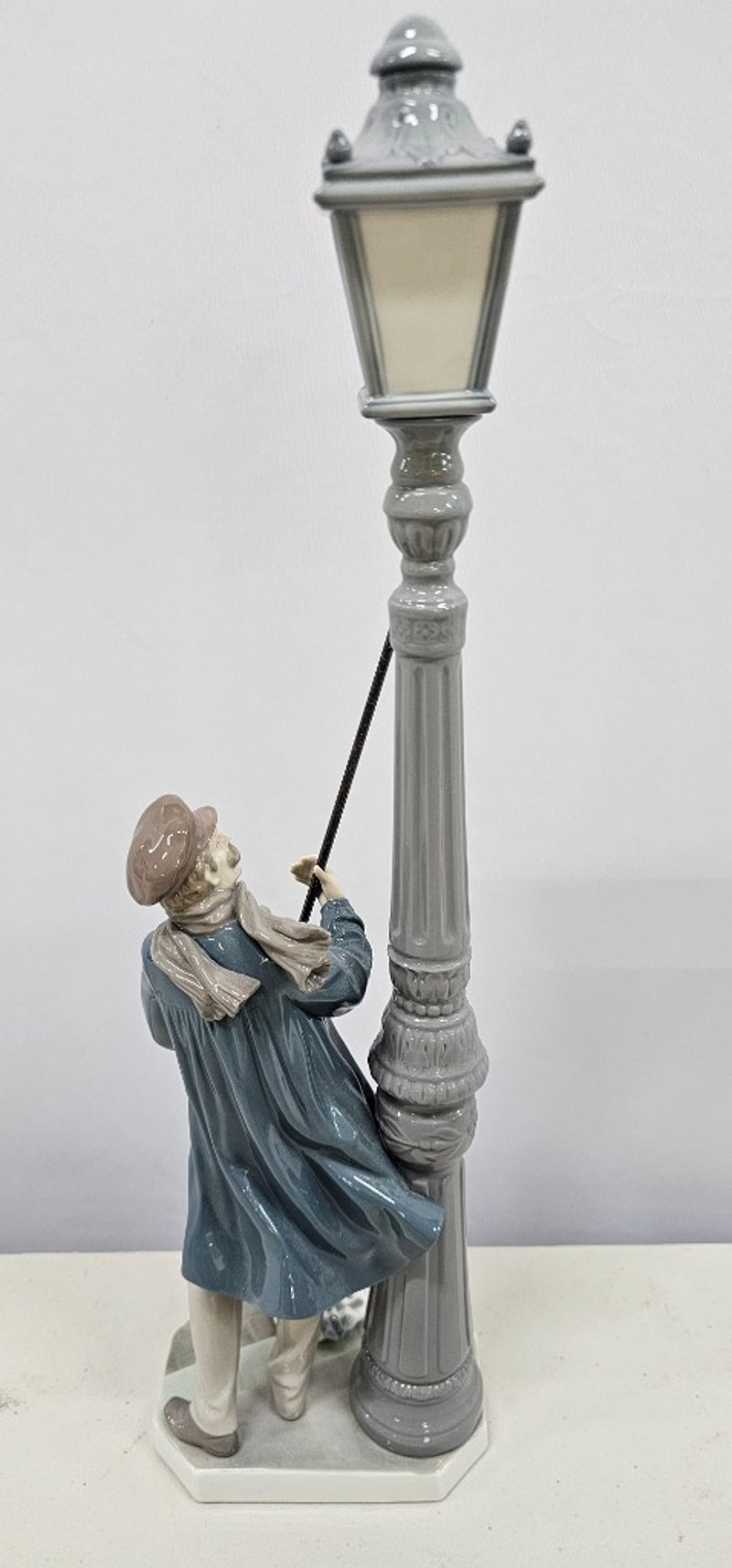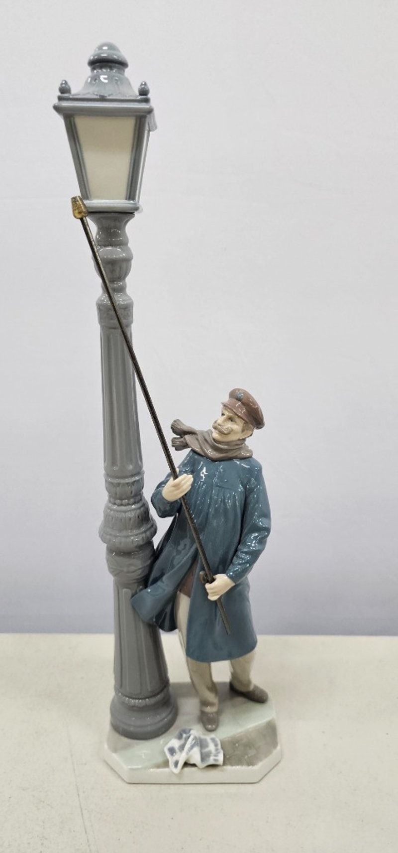 PORCELAIN FIGURINE OF LAMPLIGHTER WITH STREET LAMP Item Size: Height: 48cm, Width: 14cm, Depth: 9cm, Weight: 1Kg Condition: Good - Refer To Images 582942+1