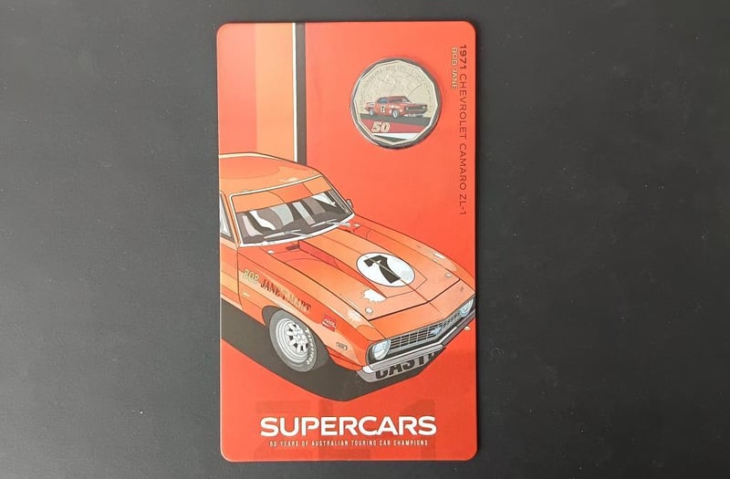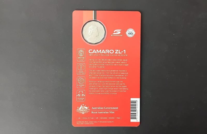 2020 60 YEARS OF SUPER CAR 1971 CAMARO ZL1 BOB JANE COLOURED COIN IN DISPLAY HOLDER 11600+37