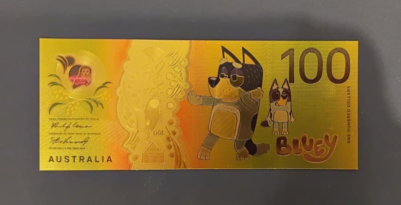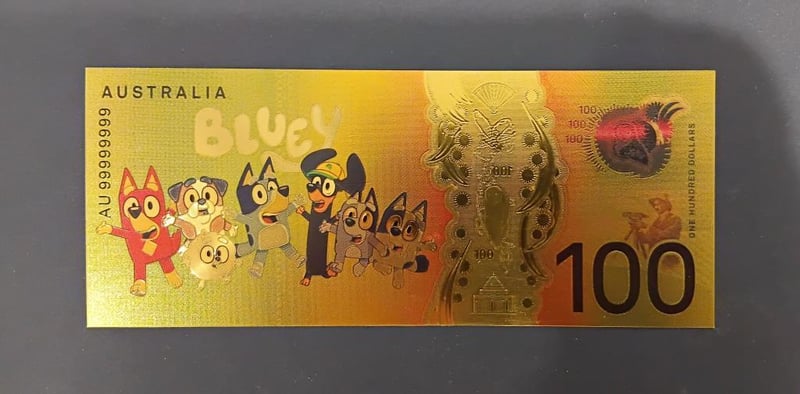 BLUEY $100 BUCKS NOTE 24K Gold Covered, Collectors Note, Celerbrating Bluey And Family Series, Great Present, Finished In Vivid Metallic Style. Style After The $100 Banknote, Nice Brilliant Gold Finish, Holographic Highlights , 9999999 Serial No Unc 11600+40