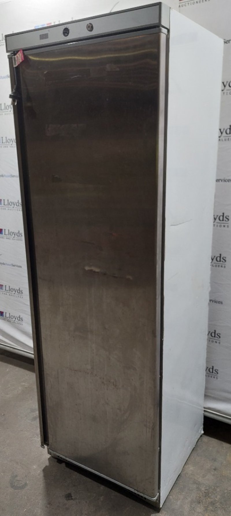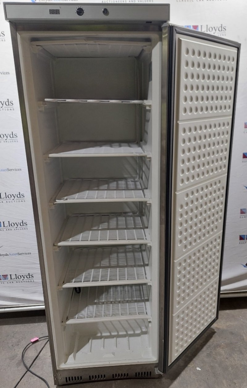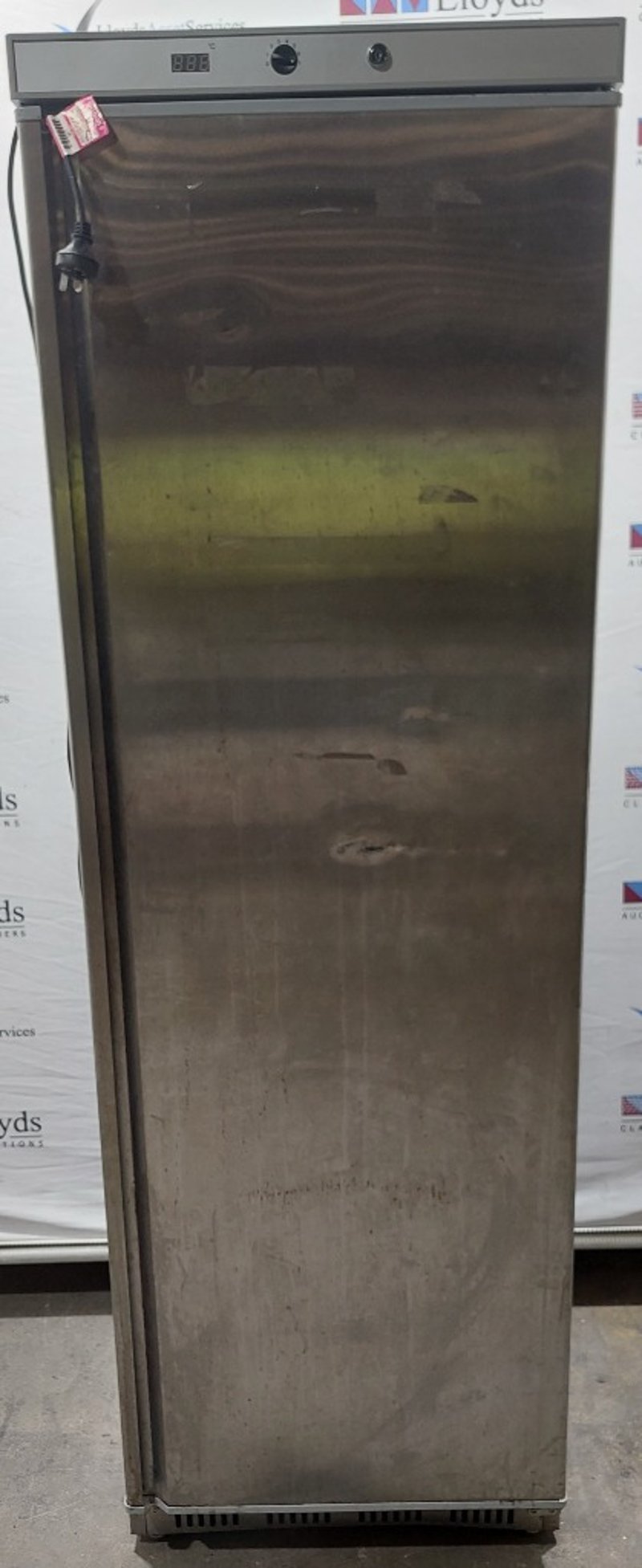 Commercial upright freezer, Model HF400 S/S, stainless steel exterior with single solid door. Interior features multiple wire shelves for organised storage. Digital temperature control with display panel. Dims: 185cm H, 60cm W, 58cm Serial no: 8086917 Notes: item untested and signs of wear
