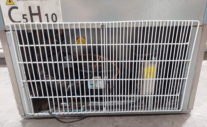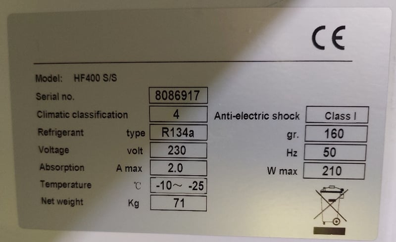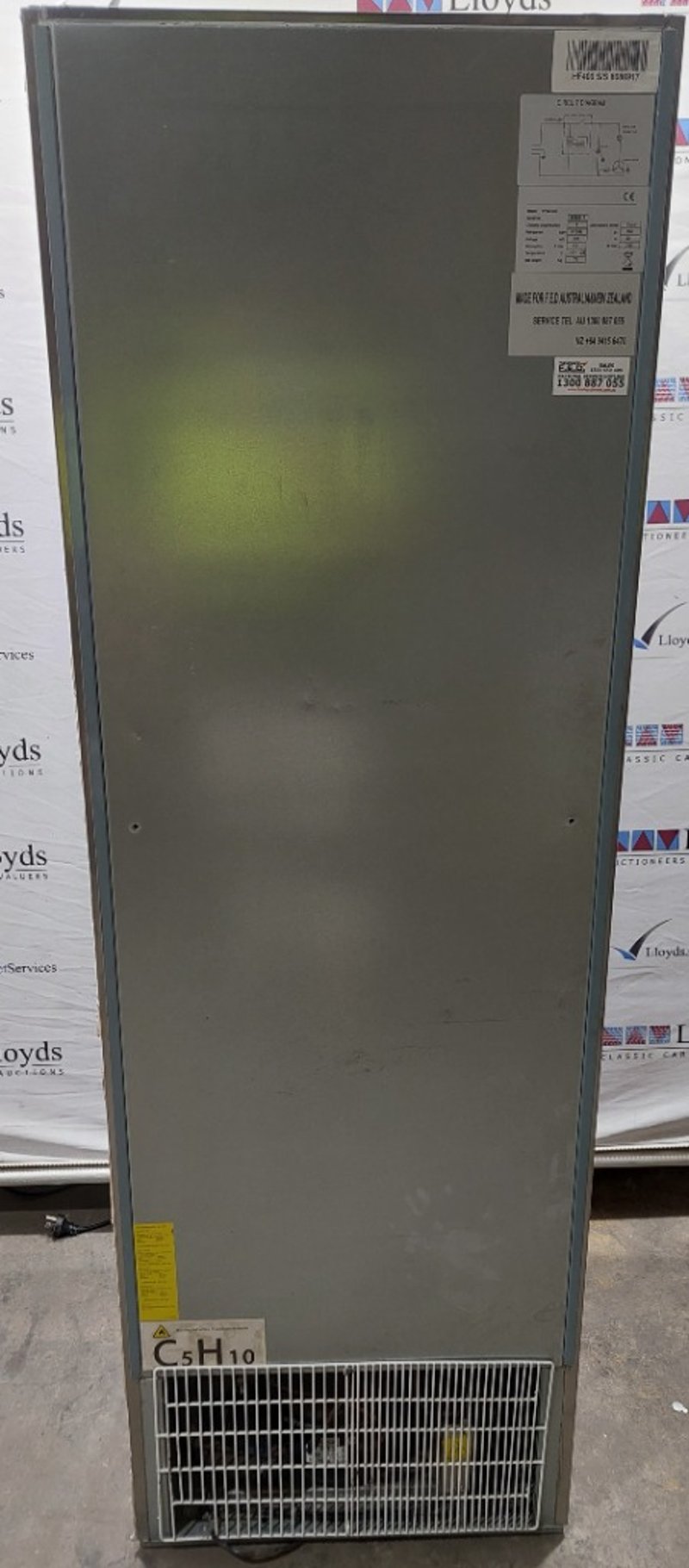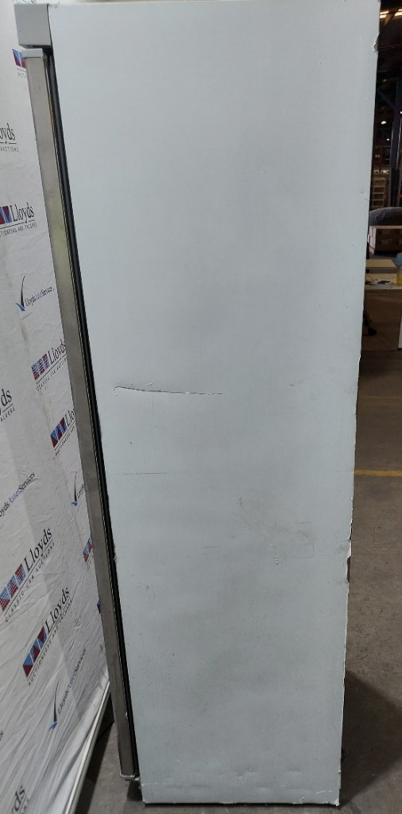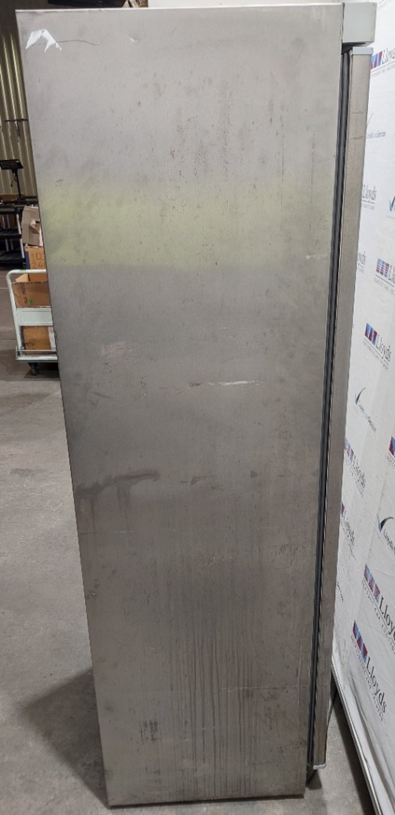 Commercial upright freezer, Model HF400 S/S, stainless steel exterior with single solid door. Interior features multiple wire shelves for organised storage. Digital temperature control with display panel. Dims: 185cm H, 60cm W, 58cm Serial no: 8086917 Notes: item untested and signs of wear