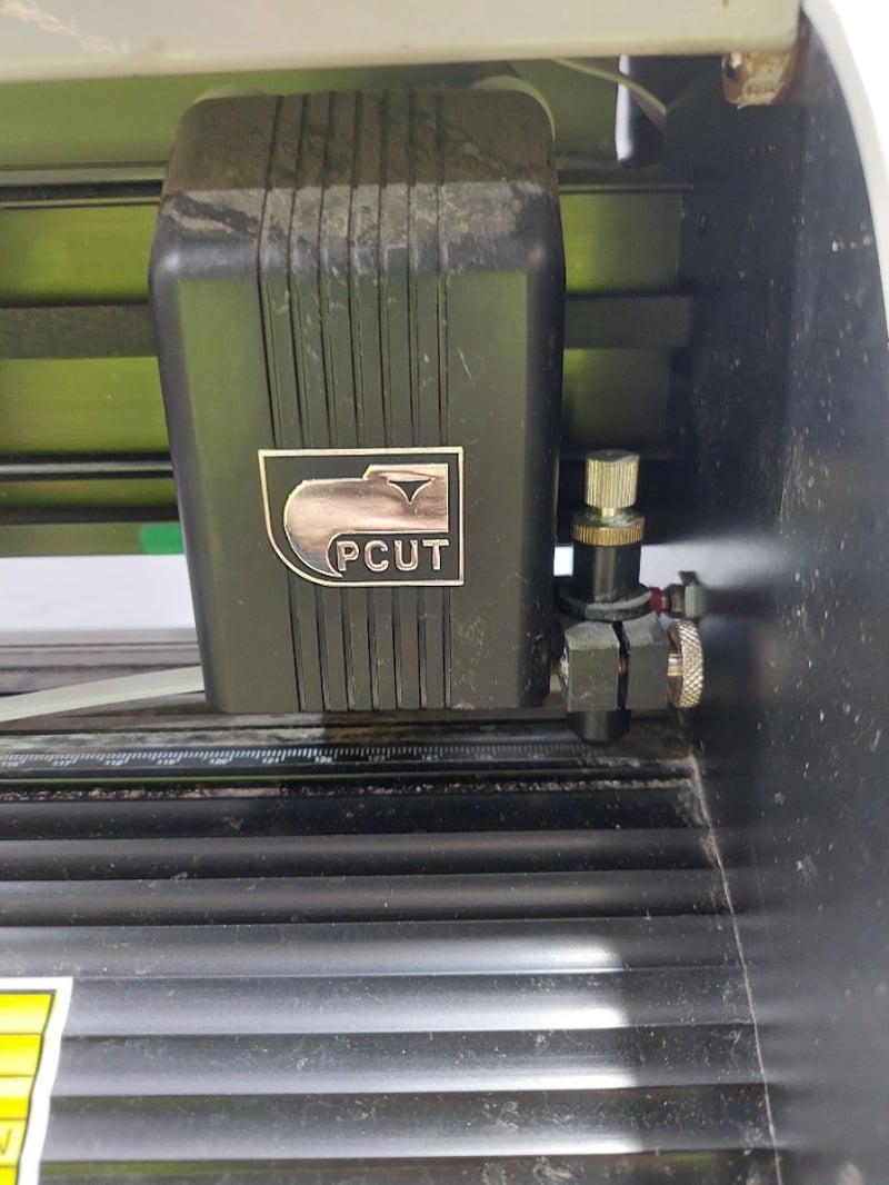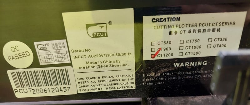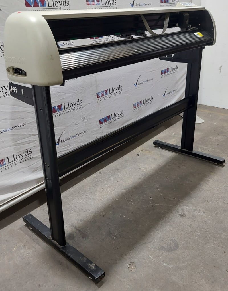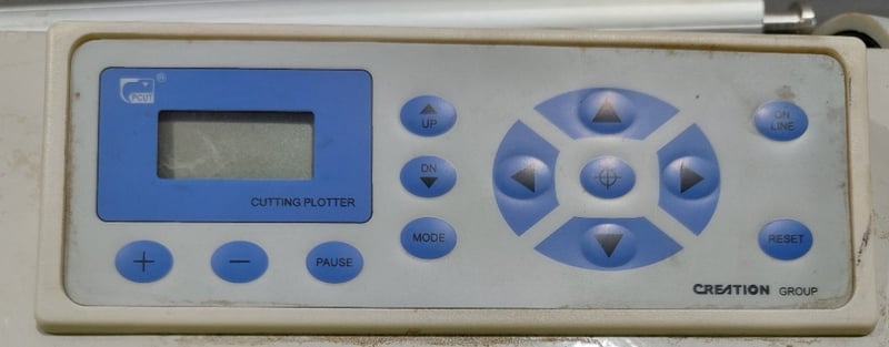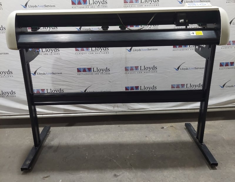 CT1200 vinyl cutting plotter in working condition. This is a professional-grade cutting plotter designed for precision cutting of vinyl, paper, and similar materials. Features a white hopper-style feed system with black frame and stand. The unit includes a digital control panel with LCD display, directional navigation buttons, and operational modes. Equipped with a PCUT cutting head mechanism and roller feed system for consistent material handling. Built-in specifications show input AC220V/110V 50/60Hz operation. Note: untested,signs of wear