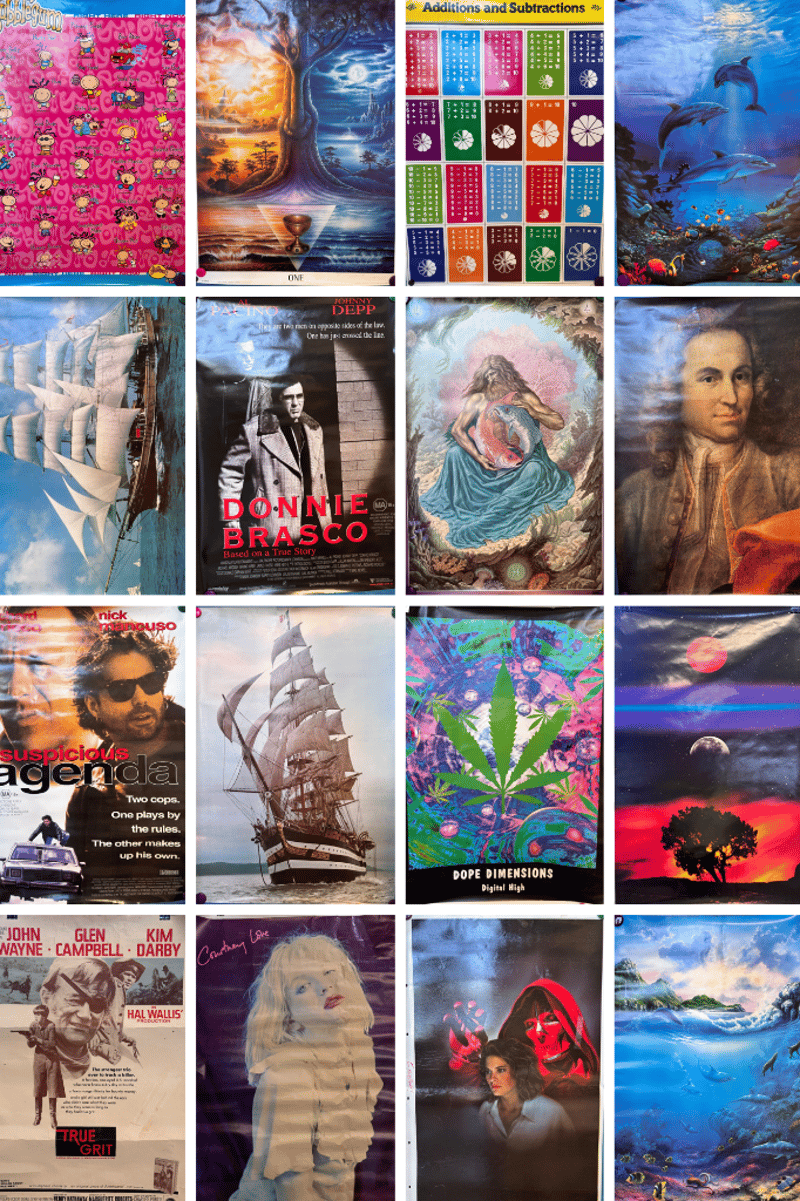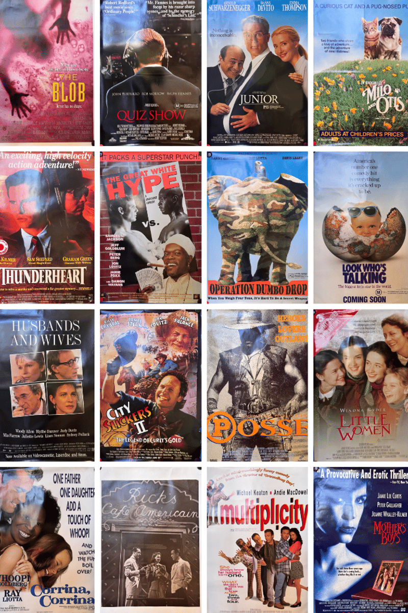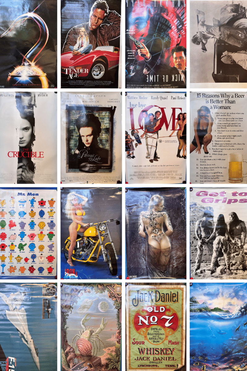 Collection of Cinema Posters Featuring Artistic, Educational, and Hollywood Movie PostersIncludes Milo and Otis, Multiplicity, The Crucible, etc