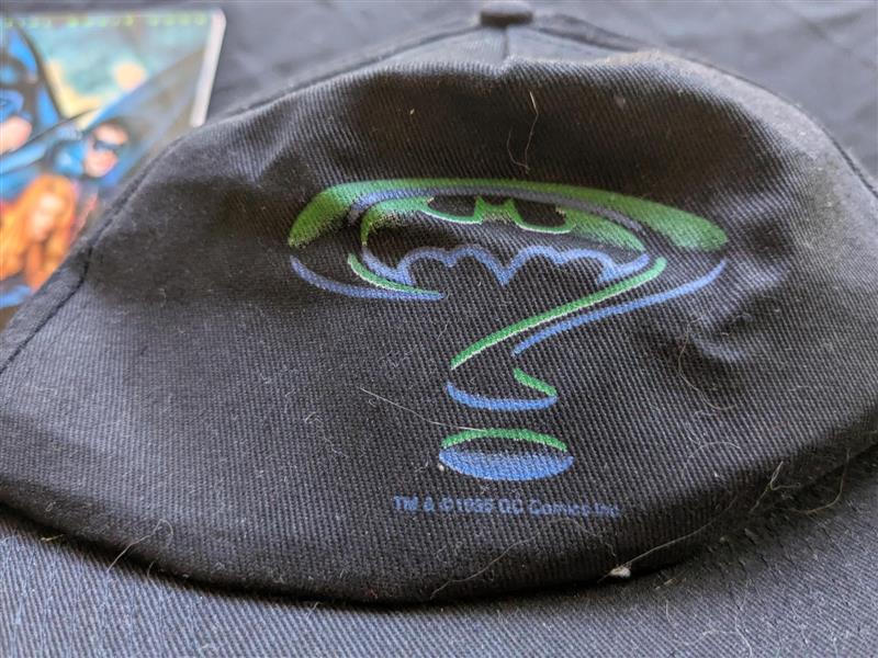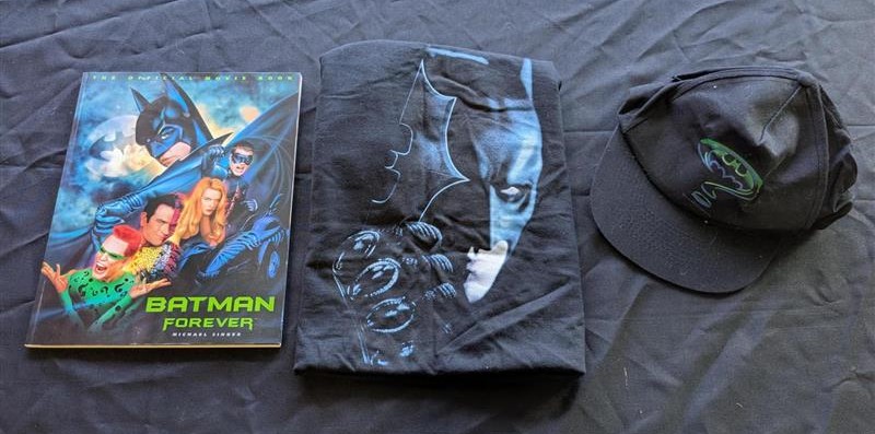 BATMAN COLLECTORS ITEMS INCLUDING BATMAN FOREVER OFFICIAL MOVIE BOOK, GRAPHIC T-SHIRT AND CAP