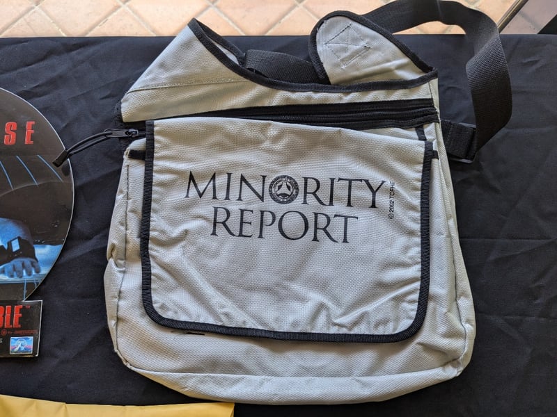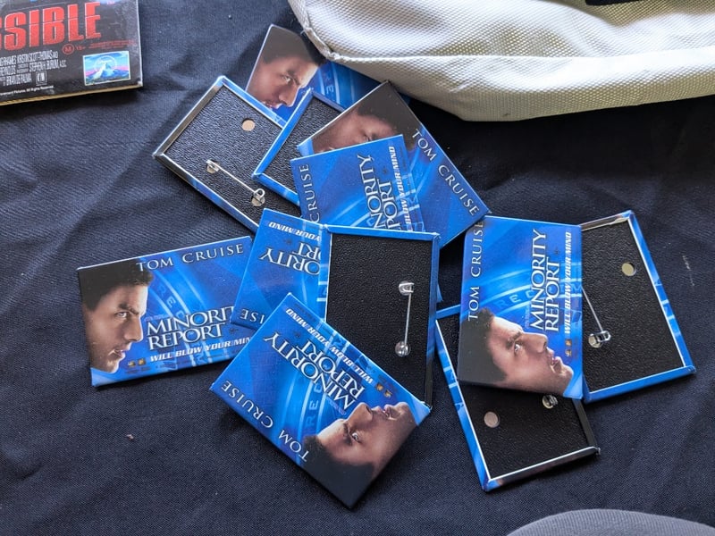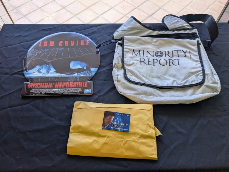 TOM CRUISE MOVIE PROMOTIONAL MERCHANDISE LOT – MISSION: IMPOSSIBLE & MINORITY REPORT Promotional Movie Merchandise Featuring Tom Cruise Films. Lot Includes A Mission: Impossible Promotional Display Stand, A Minority Report Branded Shoulder Bag, And A Collection Of Minority Report Promotional Badge Pins Presented In Small Branded Boxes. Also Included Is A Minority Report Promotional Card Or Magnet Contained Within An Envelope. Condition: Good - Refer To Images SR 233570+7