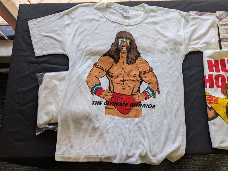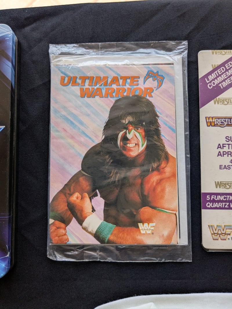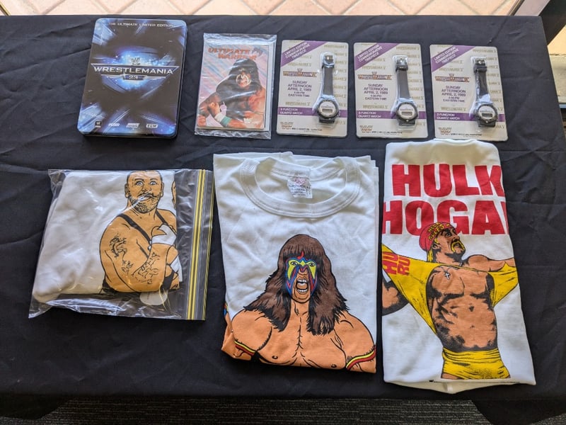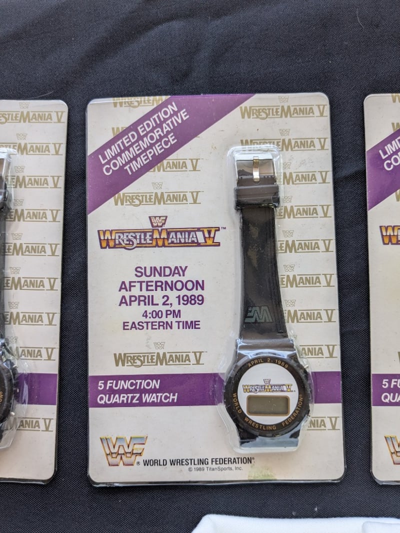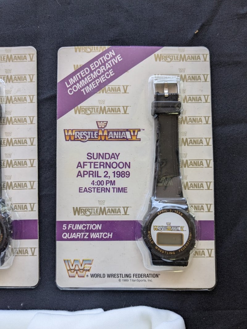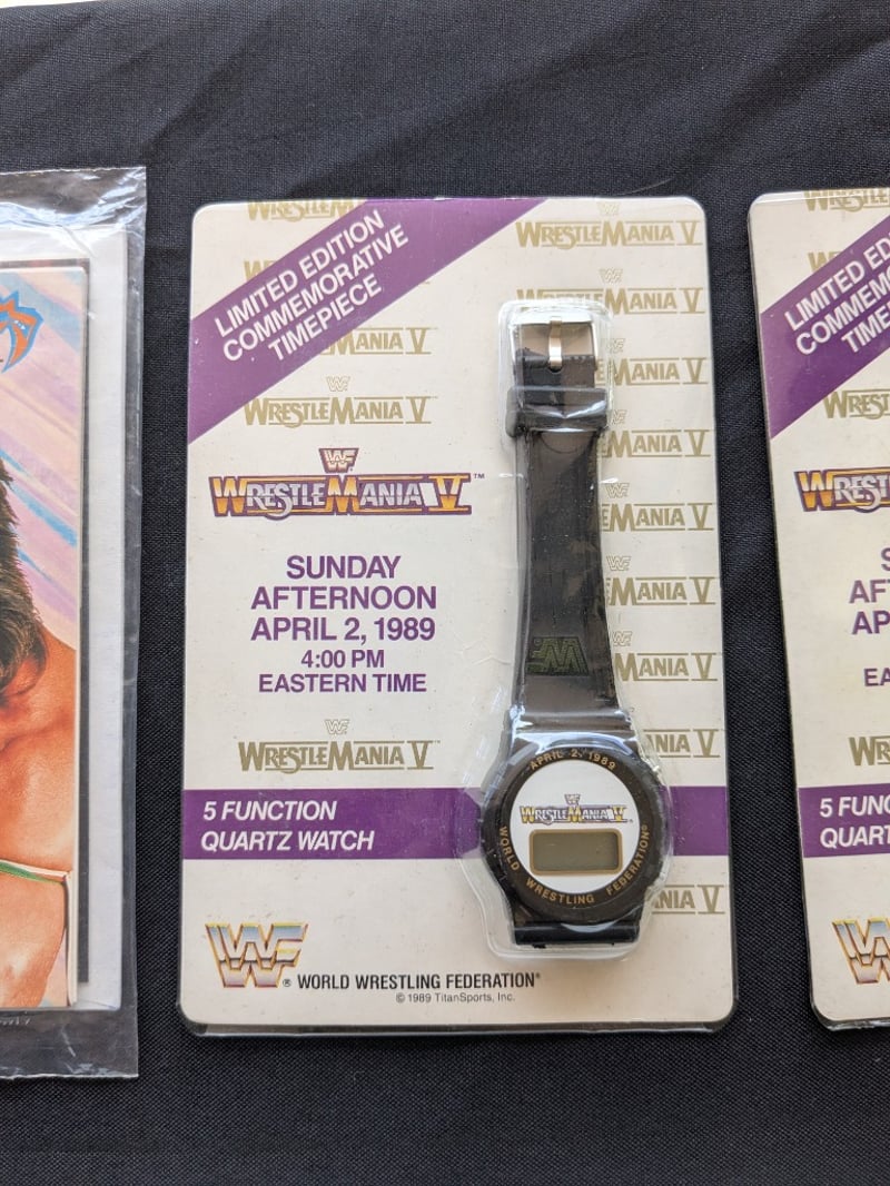 VINTAGE WWF WRESTLING MEMORABILIA LOT – WRESTLEMANIA V WATCHES, ULTIMATE WARRIOR, HULK HOGAN, BUSHWHACKERS Three Sealed Wrestlemania V Limited Edition Commemorative Digital Watches On Original Cards Dated Sunday Afternoon April 2, 1989, Each Labeled “5 Function Quartz Watch” With Wwf Branding And Titan Sports Copyright. Also Included Is A Wwf Wrestlemania 23 Limited Edition Steelbook Dvd Case, A Wrestlemania Iii Commemorative Framed Film Cell Display, And A Sealed Ultimate Warrior Greeting Card Pack And Multiple T-Shirts Condition: Good - Refer To Images SR 233570+11