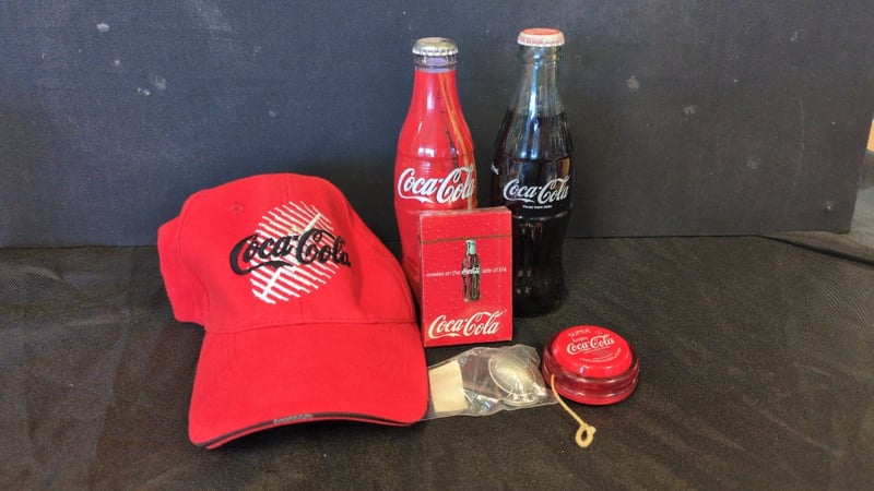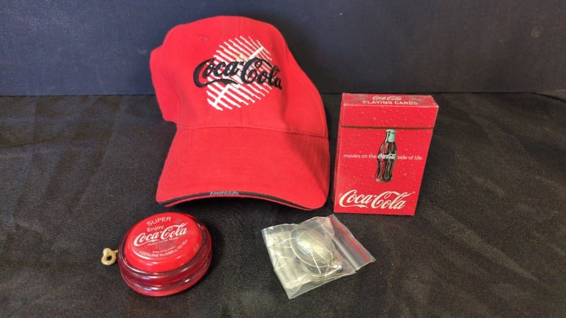 2X Collectable Coca Cola Glass Bottles, 1X Coca Cola Rugby World Cup 2003 Hat And Keychain, Coca Cola Playing Cards, And Coca Cola Vintage Style Yo-Yo