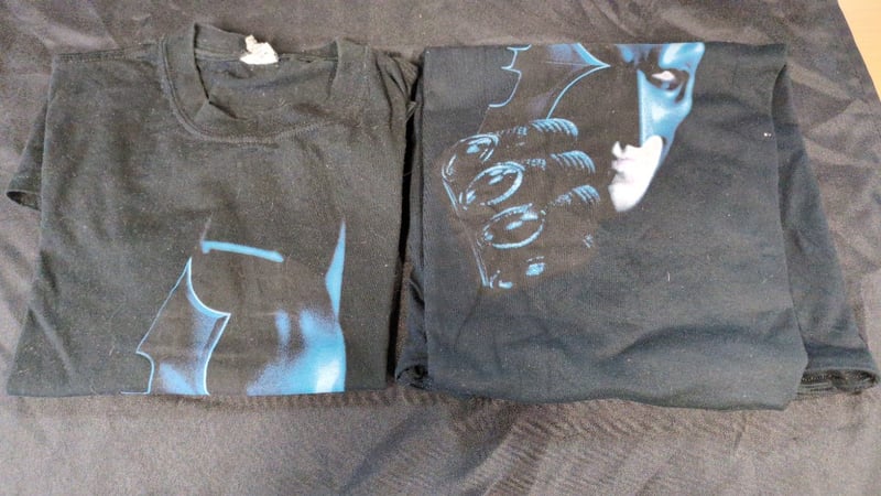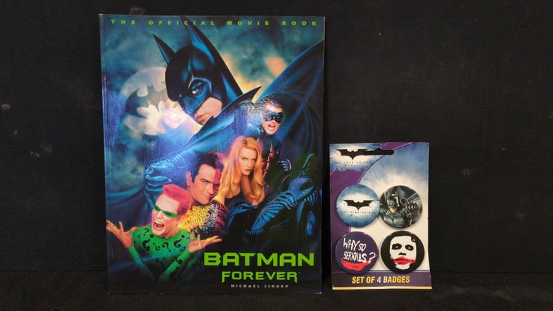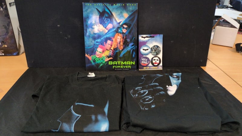 BLOCKBUSTER BATMAN COLLECTORS SET 2X Batman T-Shirts, 1X Batman Forever The Official Movie Book, And 1X Set Of 4 Batman Badges Condition: Good - Refer To Images SR 233570+34