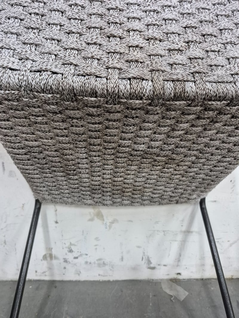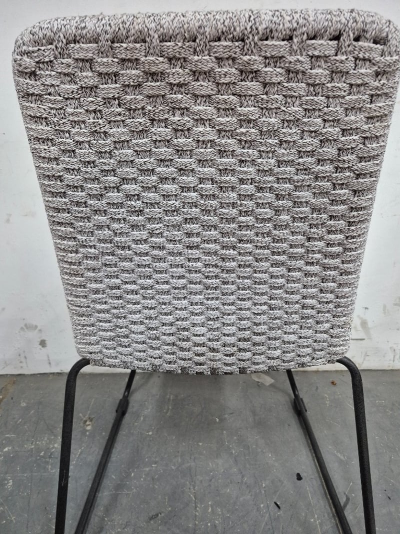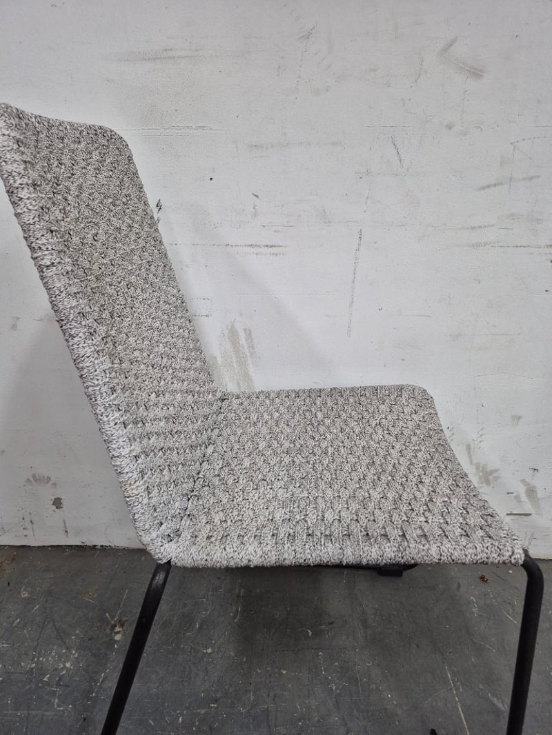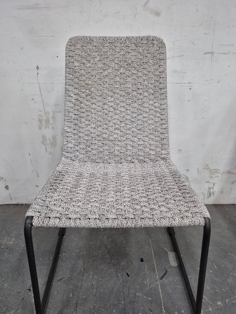 Dining Chair Light Grey, Crochet Design with metal legs Worn Condition, refer to images Dimensions: H90CMxL45CMxW45CM