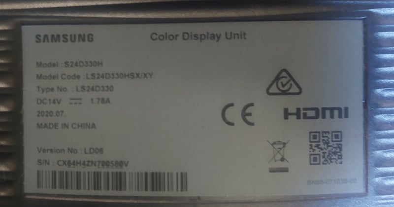 Monitor - Samsung S24D330H, 24", DOM: 07/20, S/N: CX54H4ZN700580VNote: untested,signs of wear