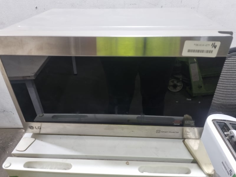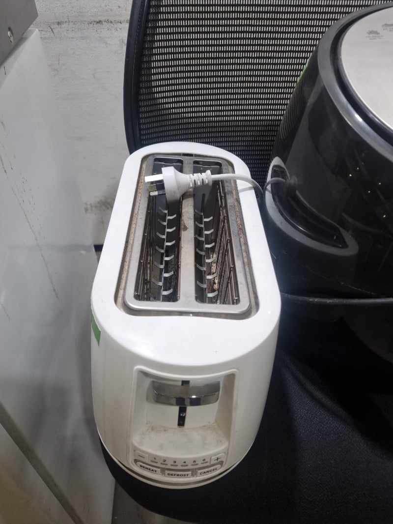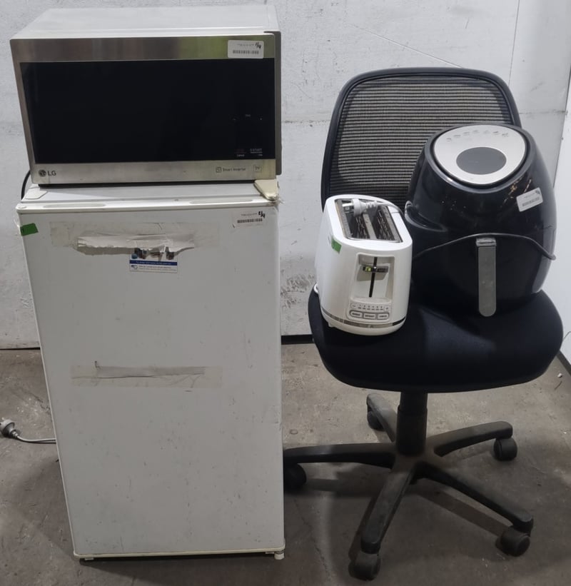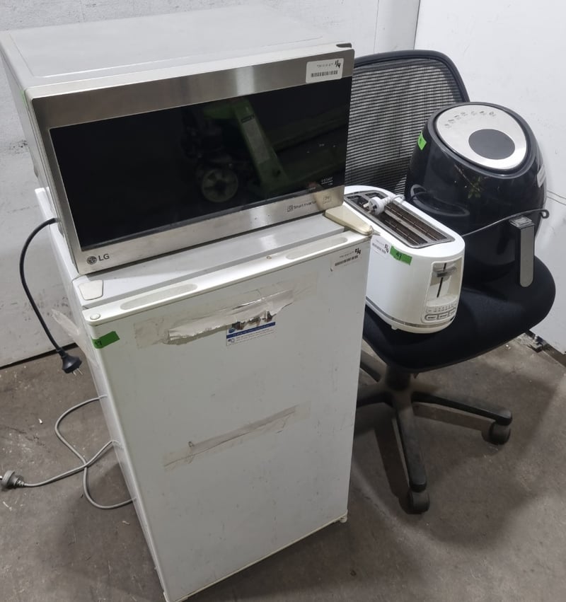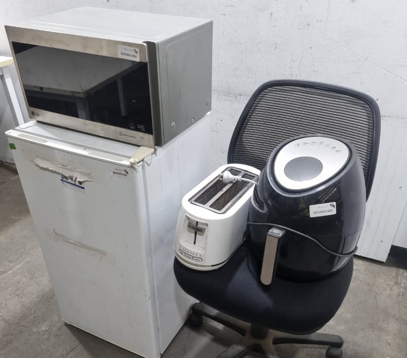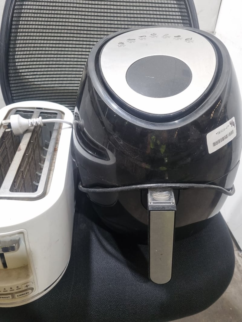 Appliances and kitchen items, including toaster, air fryer, LG microwave oven and Esatto bar refrigerator