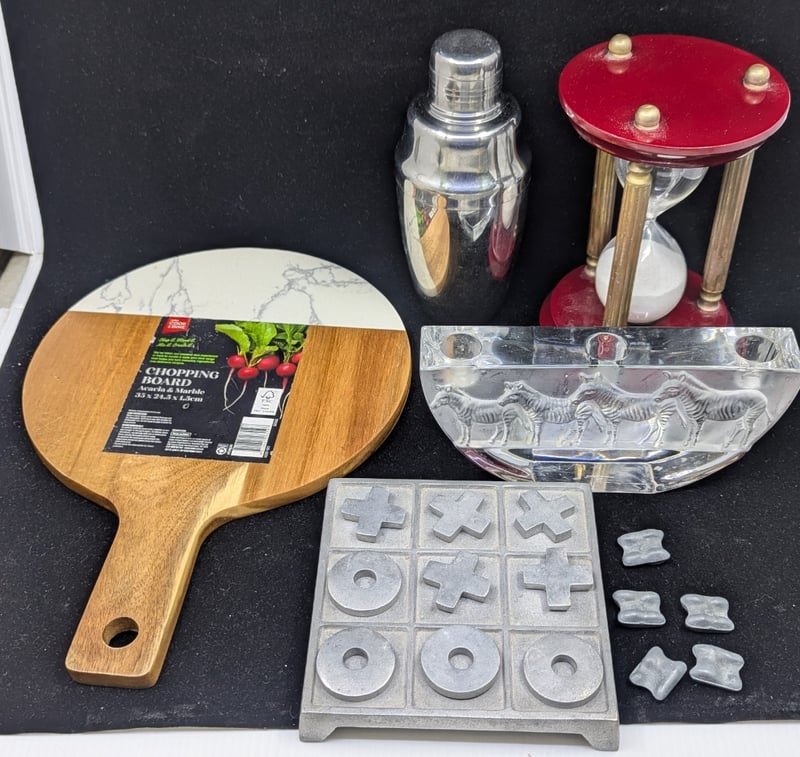 Includes Sand Timber, Crystal Candle Holder With Frosted Glass Zebra Design, Cocktail Shaker, Timber Chopping Board With Marble Style End, Metal Tic-Tac-Toe Board And Pieces