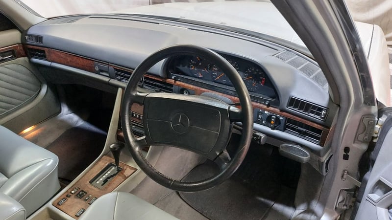 1989 Mercedes‑Benz 300SEL four‑door sedan finished in Silver. Rear‑wheel drive configuration powered by a 3.0‑litre inline six‑cylinder petrol engine paired with an automatic transmission. Odometer indicating 108,840 kilometres. Seating for five occupants.