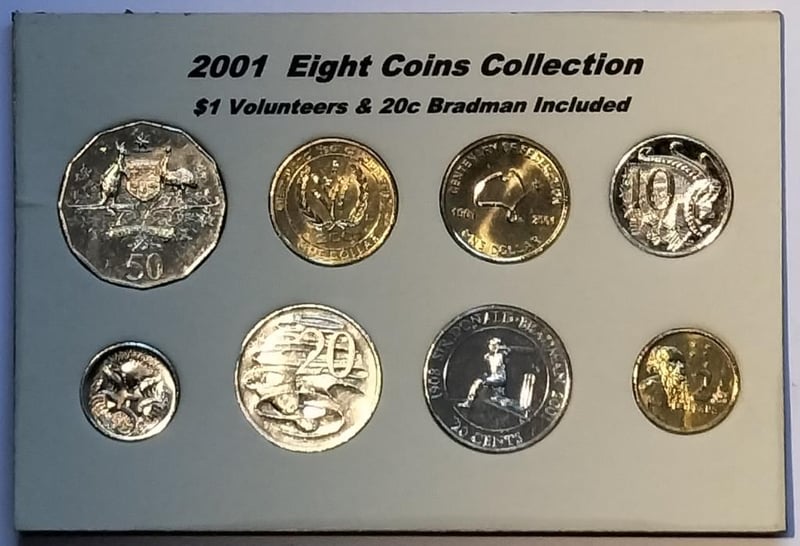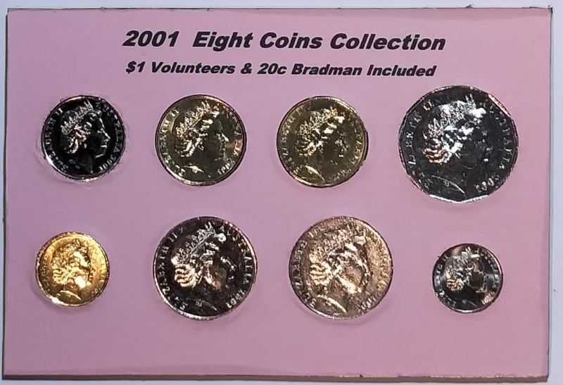 2001 EIGHT COINS COLLECTION $1 VOLUNTEERS & 20C BRADMAN INCLUDED Condition: UNCEx Mint Roll488537+5