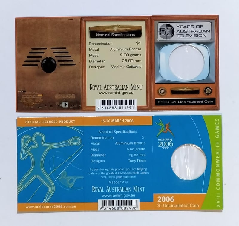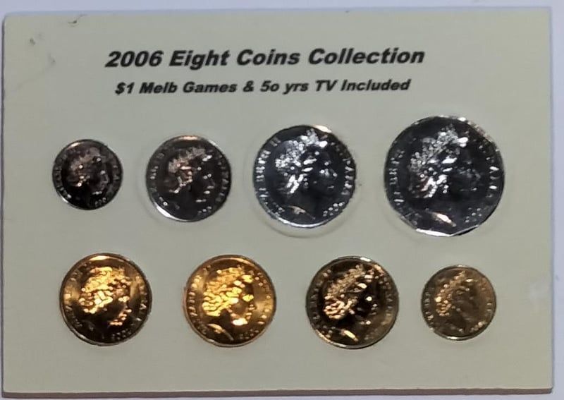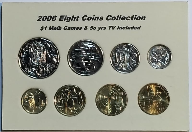 2006 EIGHT COINS COLLECTION TRIO $1 MELB. GAMES, 50 YRS TV & MOB OF ROOS INCLUDED Condition: UNCEx Mint Roll488537+18