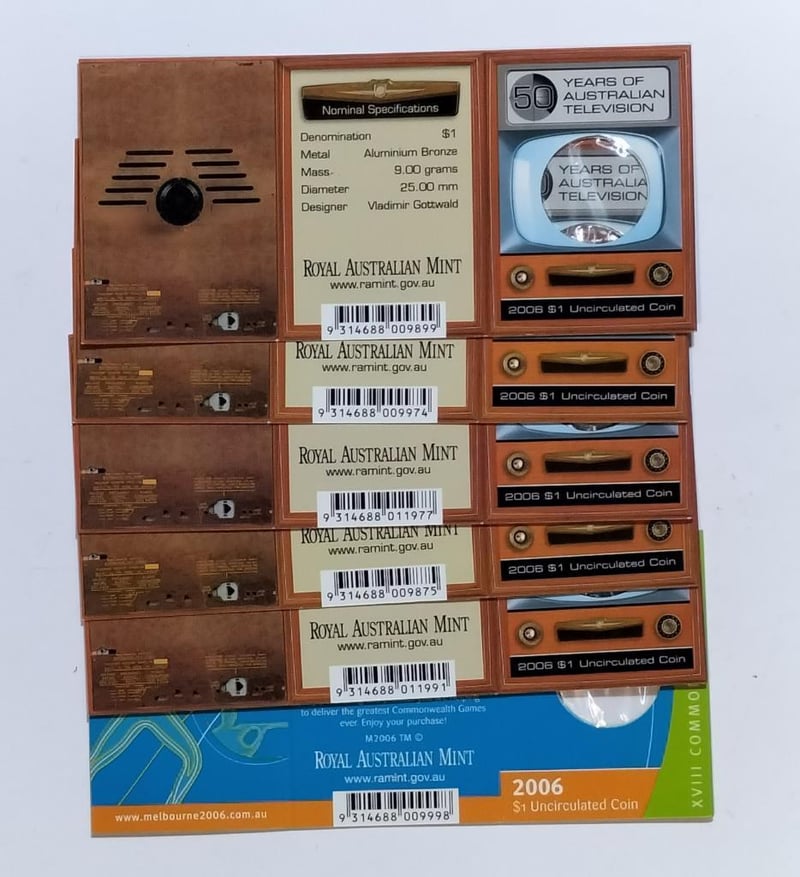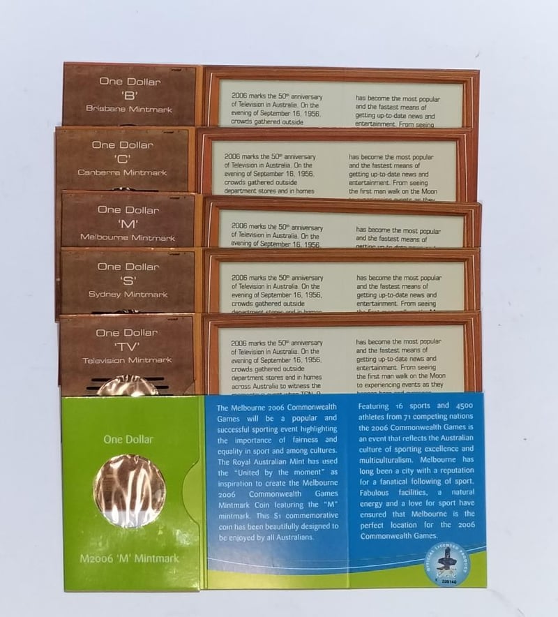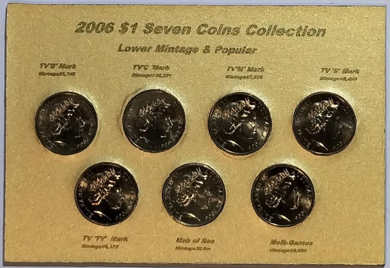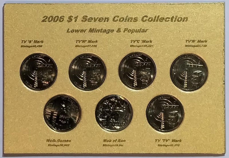 2006 SEVEN $1 COINS COLLECTION TV 5 MINTMARK & MELB. GAMES, MOB OF ROOS INCLUDED Condition: UNCEx Mint Folder488537+19