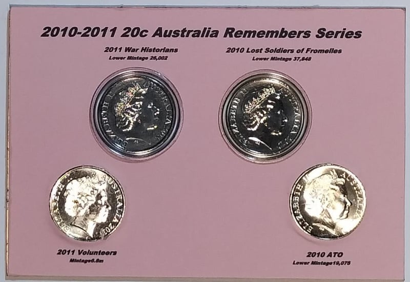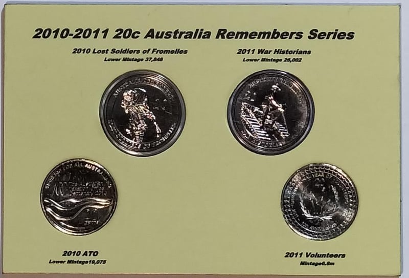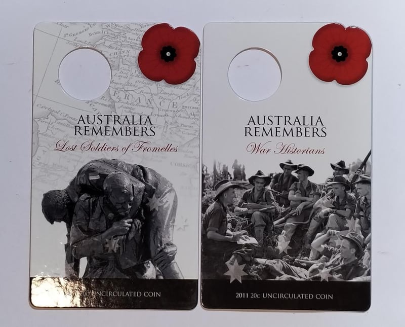 2010-2011 20C AUSTRALIA REMEMBERS SERIES LOWER MINTAGE LOST SOLDIERS OF FROMELLES 2010 & WAR HISTORIANS 2011 INCLUDED Condition: UNCEx Mint Roll/Card488537+28