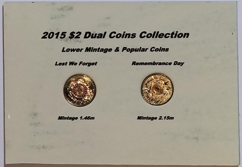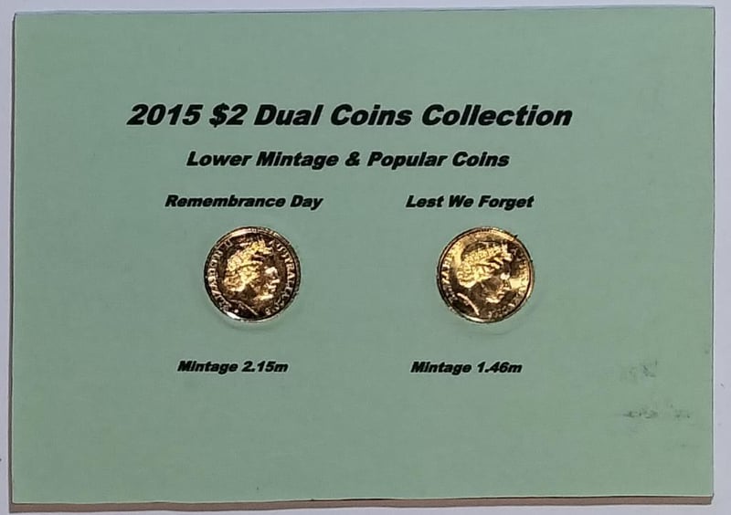 2015 DUAL $2 COINS COLLECTION LOWER MINTAGE & POPULAR COINS LEST WE FORGET(RED RING) & REMEMBRANCE DAY(ORANGE RING) Condition: UNCEx Mint Roll/Bag488537+31