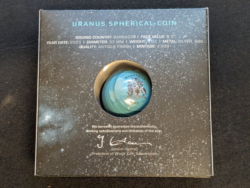 2023 FIVE DOLLAR BARBADOS URANUS SPHERICAL SILVER COINCondition: ProofProvenance: Barbados (Official Issue)585090+56