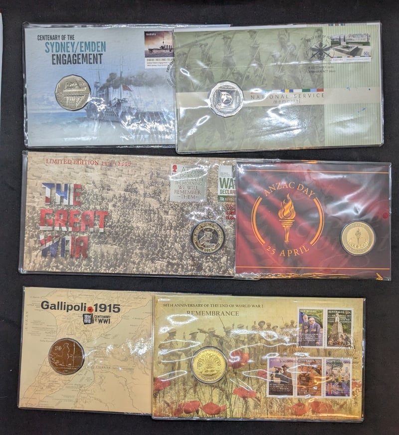 COLLECTION OF AUSTRALIAN WAR COMMEMORATIVE COINS COLLECTION (2008-2025)Includes 2014 Centenary Of The Sydney/ Emden Engagement Coin, 2010 National Service Coin, 2014 The First World War Coin, EtcCondition: Unc585090+90