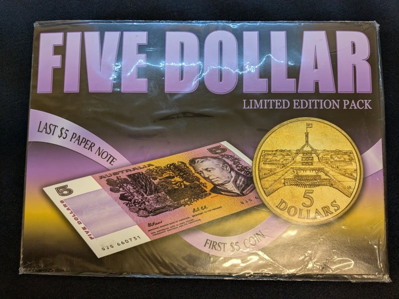1988 AUSTRALIA FIVE DOLLAR LIMITED EDITION PACK - LAST $5 PAPER NOTE & FIRST $5 COINCondition: Unc585090+101