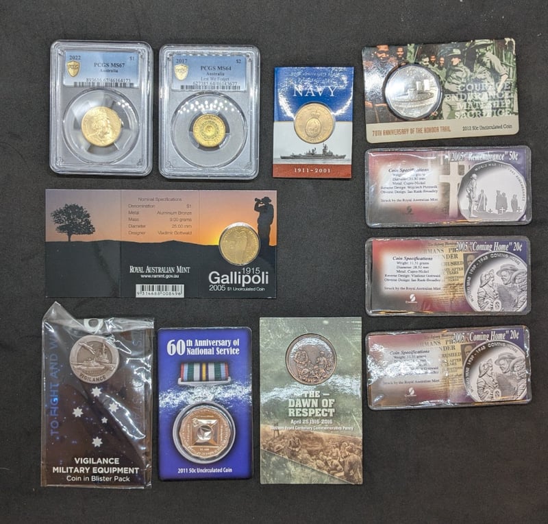 MIXED AUSTRALIAN COMMEMORATIVE COINS AND MILITARY MEDALS COLLECTION (2005-2022)Condition: UncProvenance: Royal Australian Mint585090+106