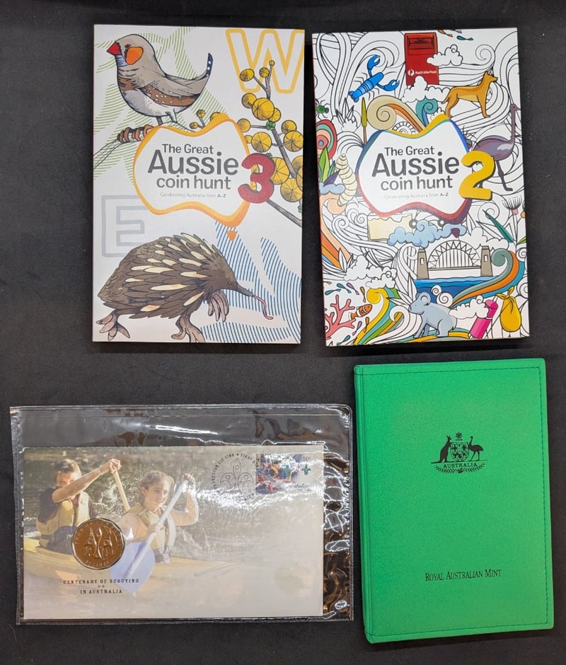 THE GREAT AUSSIE COIN HUNT COLLECTION EMPTY FOLDERS (VOLUME 2 AND 3), 1992 THE ROYAL AUSTRALIAN MINT 1992 PROOF SET, 2008 YEAR OF THE SCOUT AUSTRALIAN FIFTY CENT COINCondition: Unc585090+116
