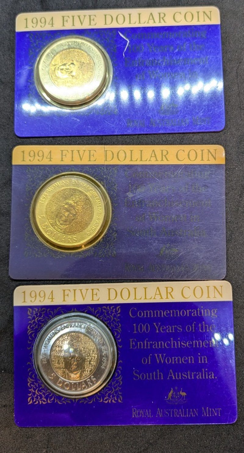 THREE 1994 AUSTRALIAN FIVE DOLLAR COMMEMORATIVE COIN SERIES - WOMEN'S ENFRANCHISEMENTCondition: Unc585090+147