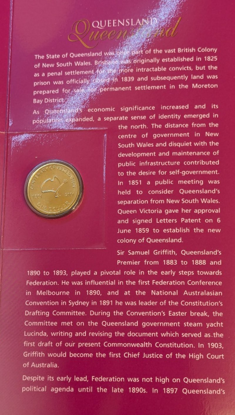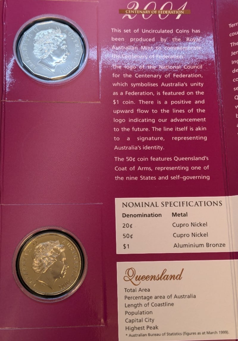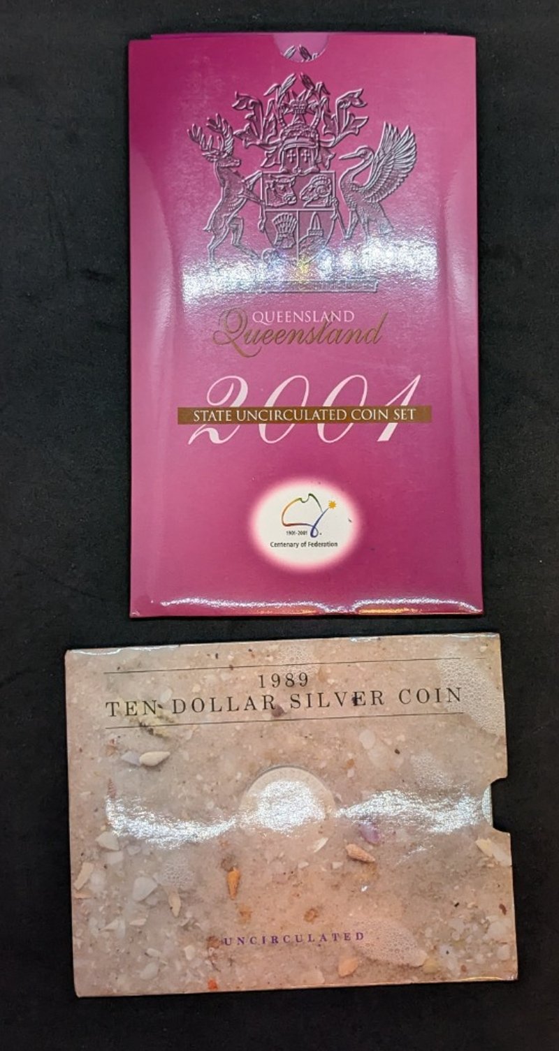 AUSTRALIA 1989 TEN DOLLAR SILVER COIN & 2001 QUEENSLAND CENTENARY OF FEDERATION UNCIRCULATED COIN SETCondition: UncProvenance: Royal Australian Mint, Canberra585090+148