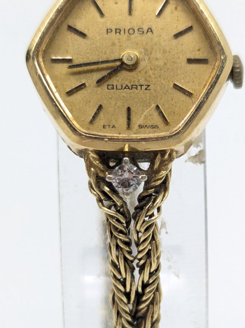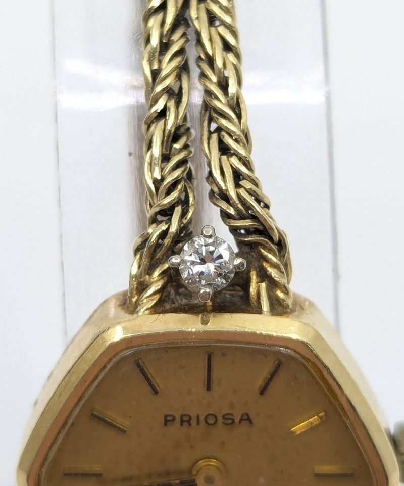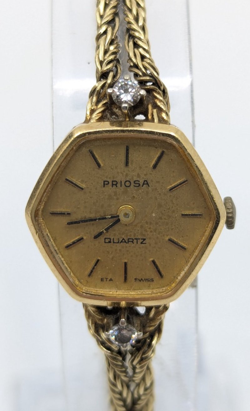 Priosa gold and diamond wristwatch, watch features two round cut white sapphire set above and below case in 4 claw setting, non numerical hour markers, case back stamped: 14k, buckle stamped: 585