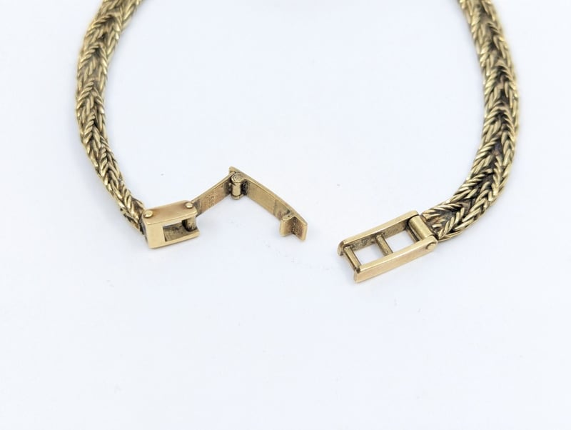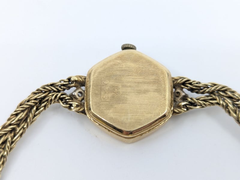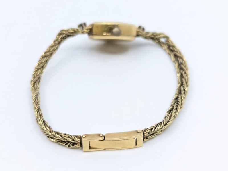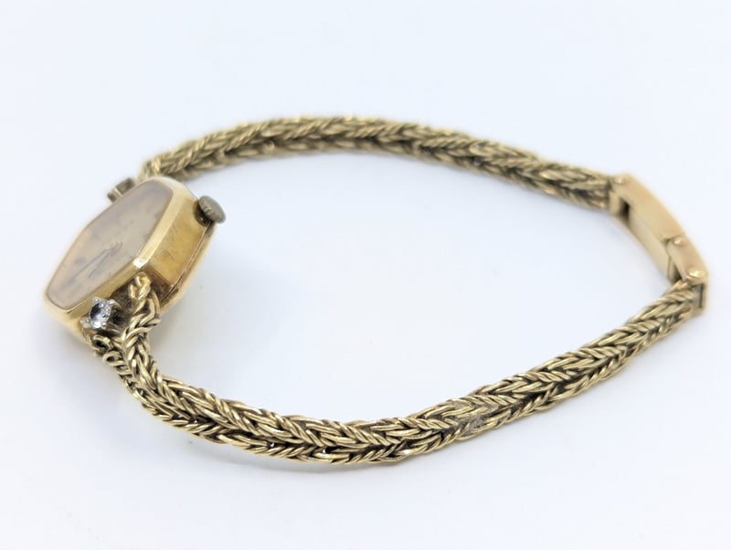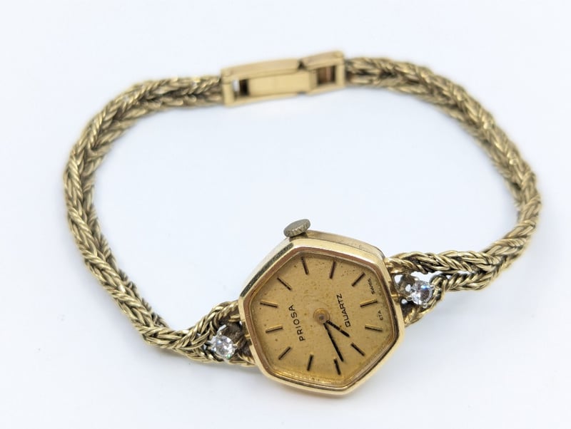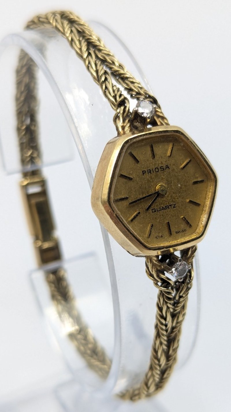 Priosa gold and diamond wristwatch, watch features two round cut white sapphire set above and below case in 4 claw setting, non numerical hour markers, case back stamped: 14k, buckle stamped: 585