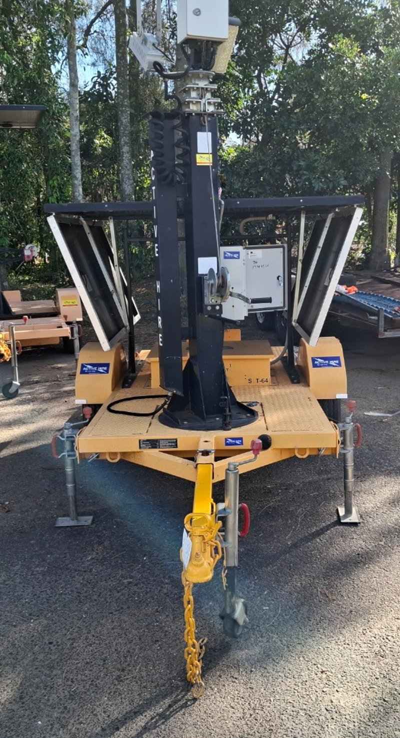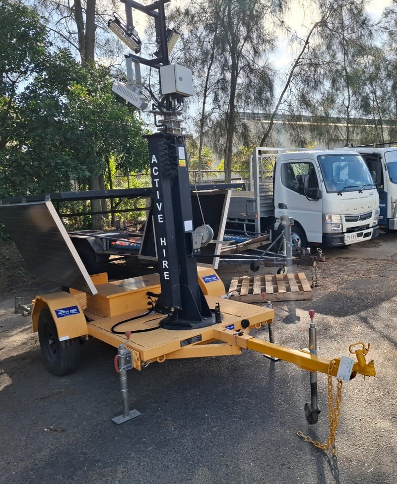 Description: Jockey Wheel, stabilising legs, telescopic light tower, 4 light sections, fuse box, light tower height from ground up 7.1mts approximately, all lights appear to be in working order, trailer length 3mts, 1.3mts wide approximately