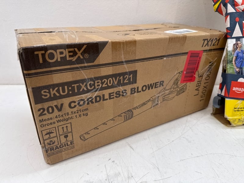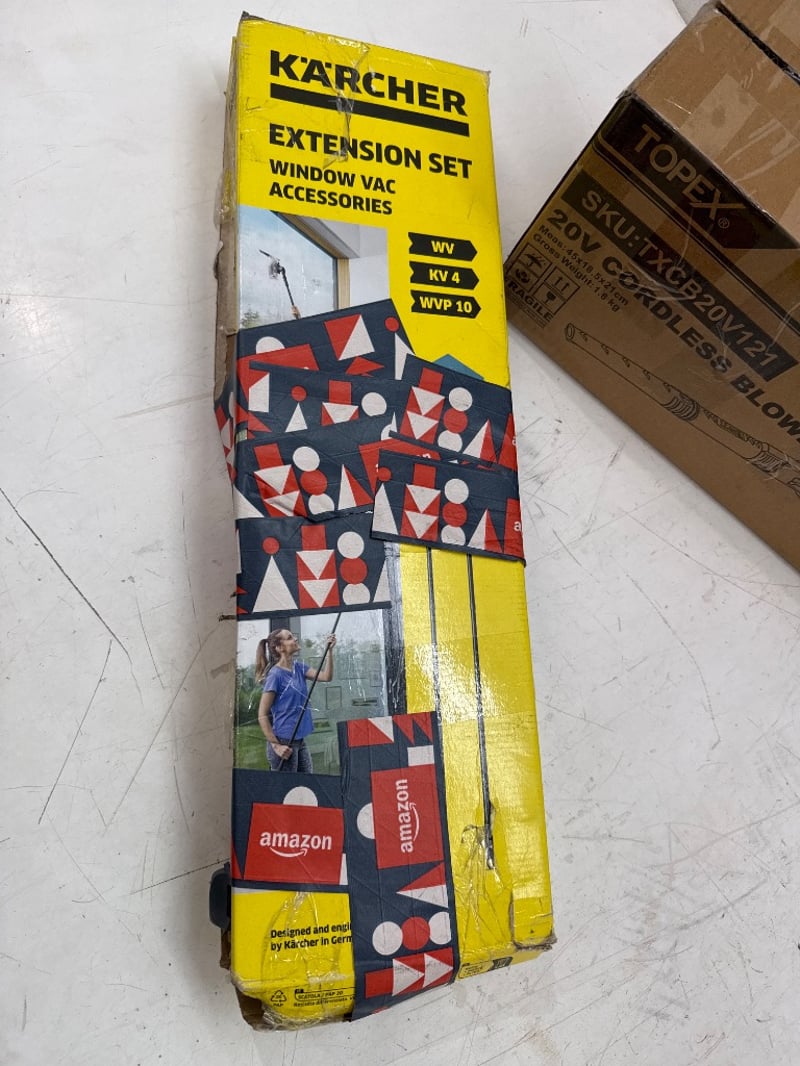 Home Maintenance pack, includes Topex 20v Cordless Blower and Karcher Window Vac Extension KitNote: damage to box cannot verify contentsSold as Lot