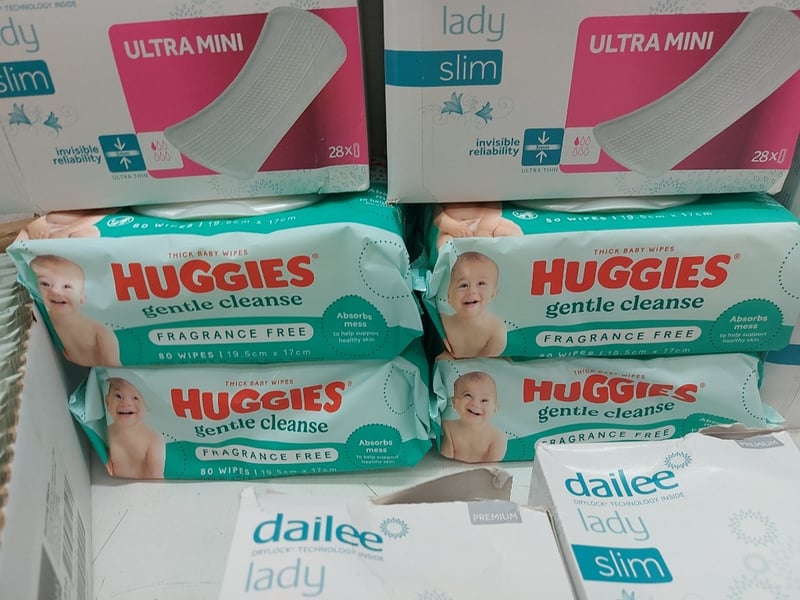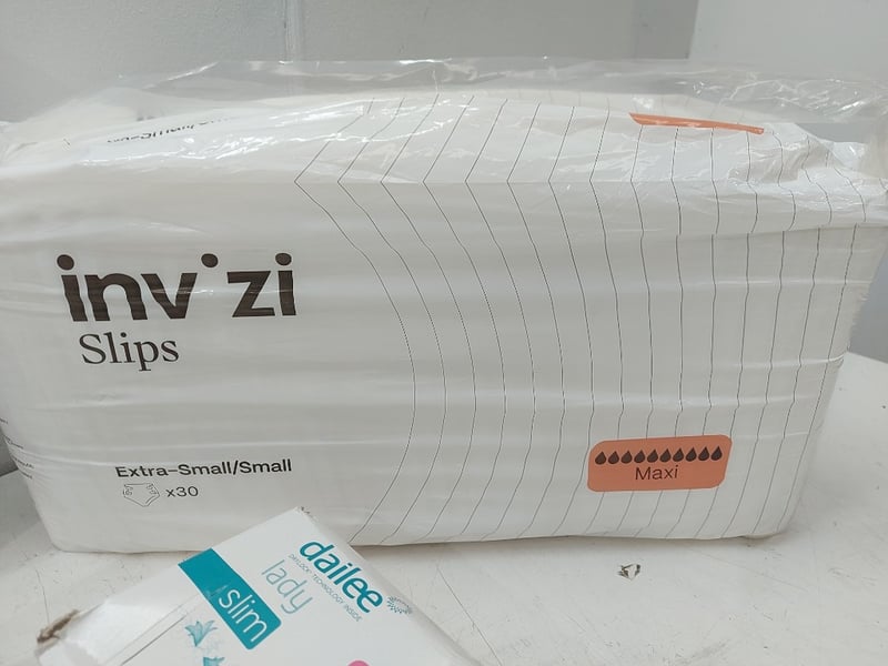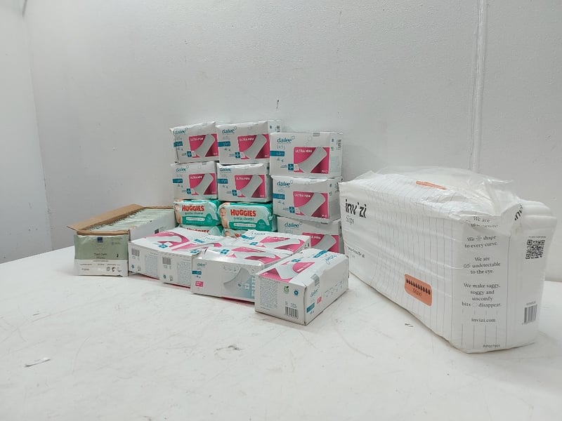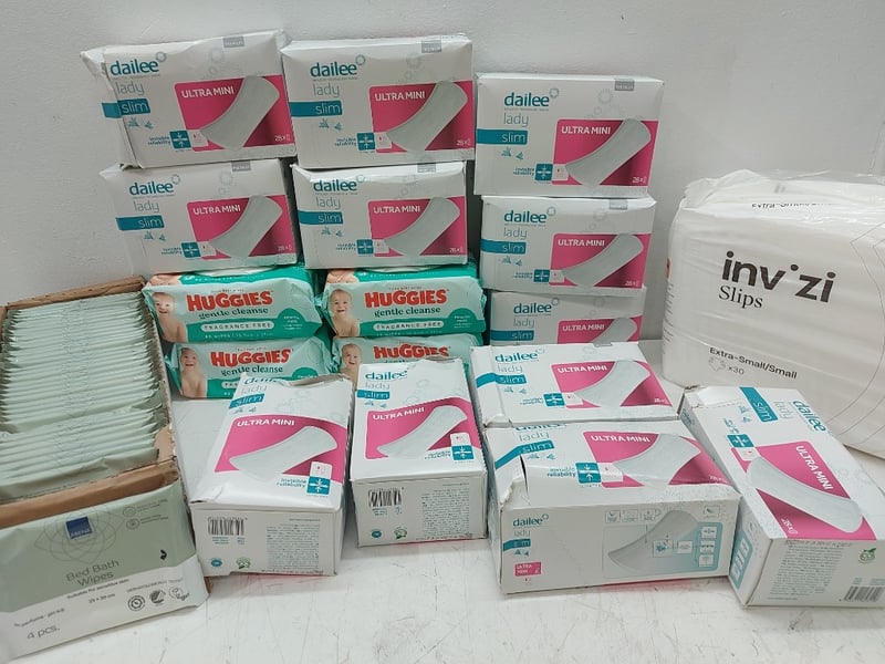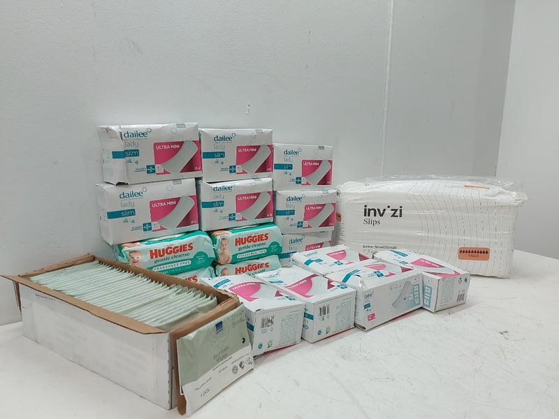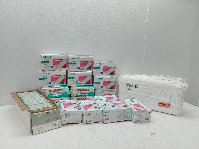 Assorted Lot Includes, Thick Baby Wipes Higgies, Bed Bath Wipes, Dailee Lady Slim Ultra Mini Ultra Thin, INV ZI Slips, Extra Small/Small Maxi, Quantity As LotSold As Lot