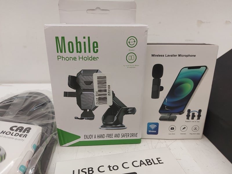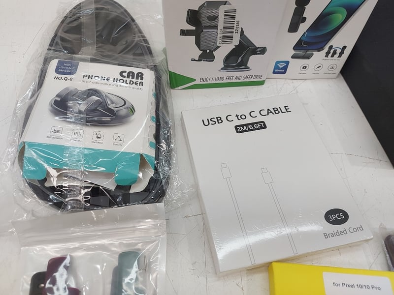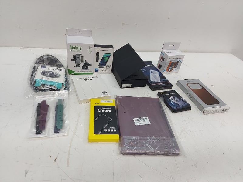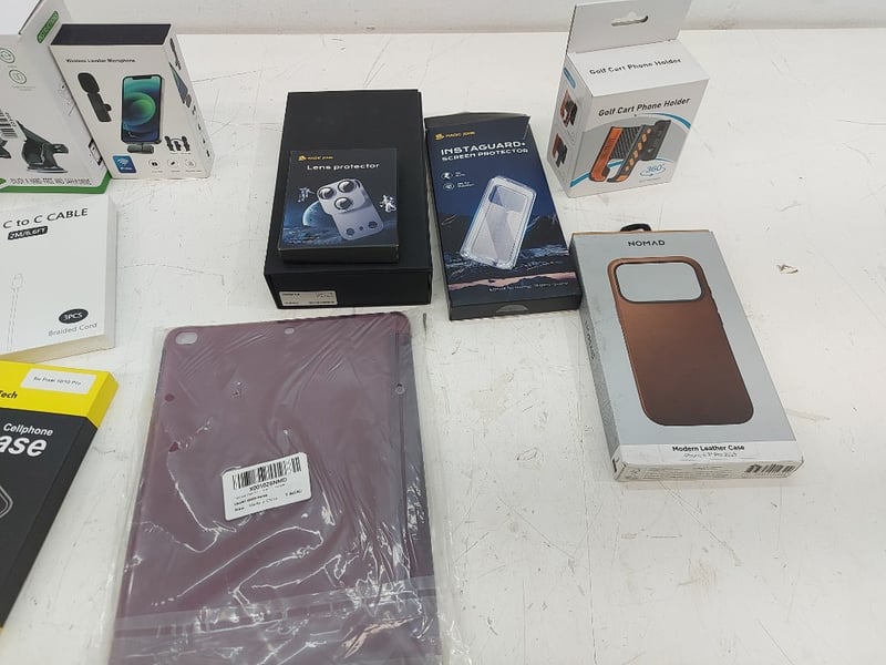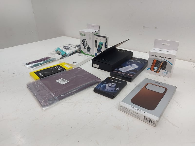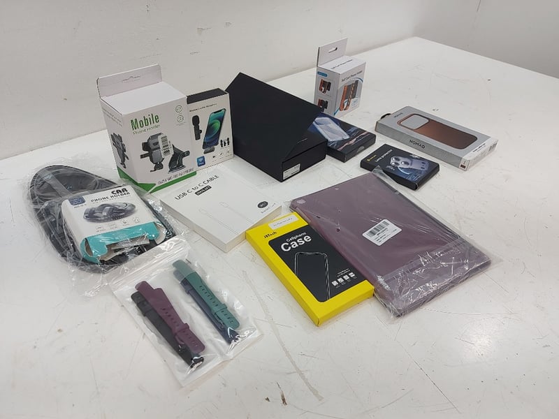 Assorted Technology Accessories Lot, Includes phone Holders, Usb C To Usb C Cable, Magic John Screen Protector, Nomad Iphone Case 6.3 Pro, And More Quantity 12