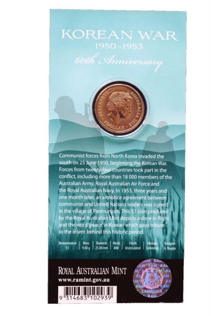 2013 KOREAN WAR $1 UNCIRCULATED CARDED COIN. 60TH ANNIVERSARY 488540+20