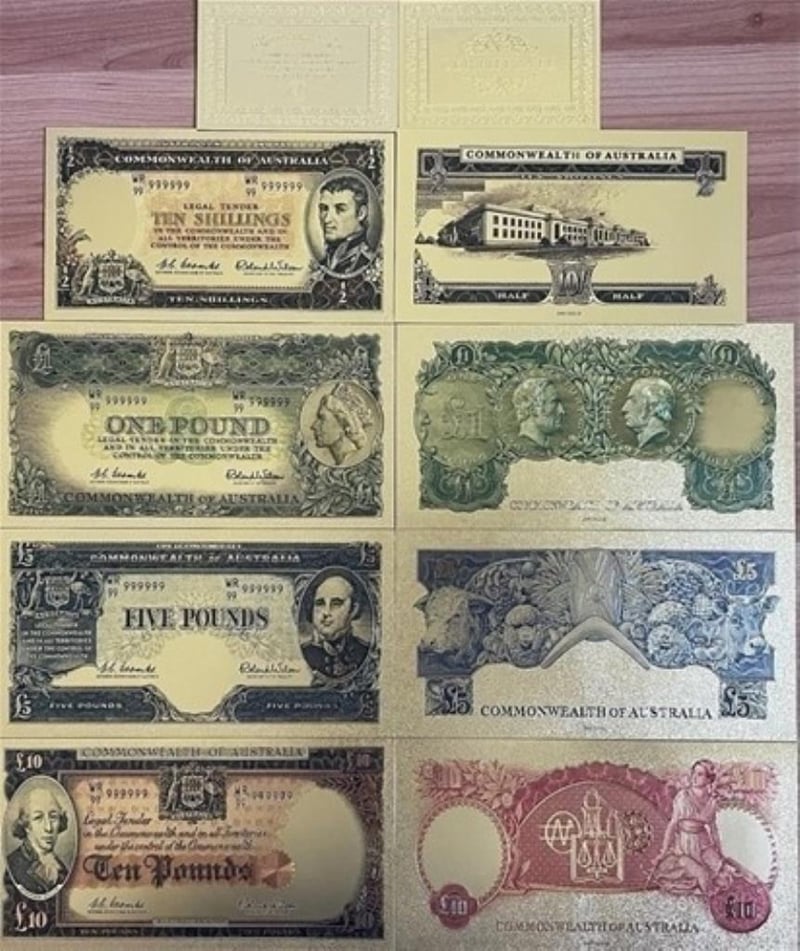 AU PREDECIMAL BANK NOTE SET LIMITED EDITION RARE BANKNOTE ALBUM-GOLD PLATED Aun Pre Bank Note Set Limited Edition Rare Banknote Album-Gold PlatedThese Limited Edition Notes Are Plated With Real 99.99% Pure Gold-Plated Banknote Of Au, Giving Them A Stunning And Luxurious Look.Each Note Features Intricate Detailing, Making Them Highly Sought After By Collectors.The Protective Folder Ensures That Your Gold Bank Notes Are Safe From Damage, Fading, And Other Potential Harm.It Also Makes It Easy To Store And Display Your Collection.Limited Edition Gold Bank NotesPlated With Real Gold For A Luxurious LookFeatures Designs Showcasing The History And Culture Of AuComes In A Protective Folder To Keep The Notes SafeEasy To Store And DisplayThese Gold Bank Notes Are A Valuable Addition To Any Collection Comes With A Golden Certificate Of AuthenticityKindly Notes This Is Not Real Gold...But Gold Plated Only 294155+2